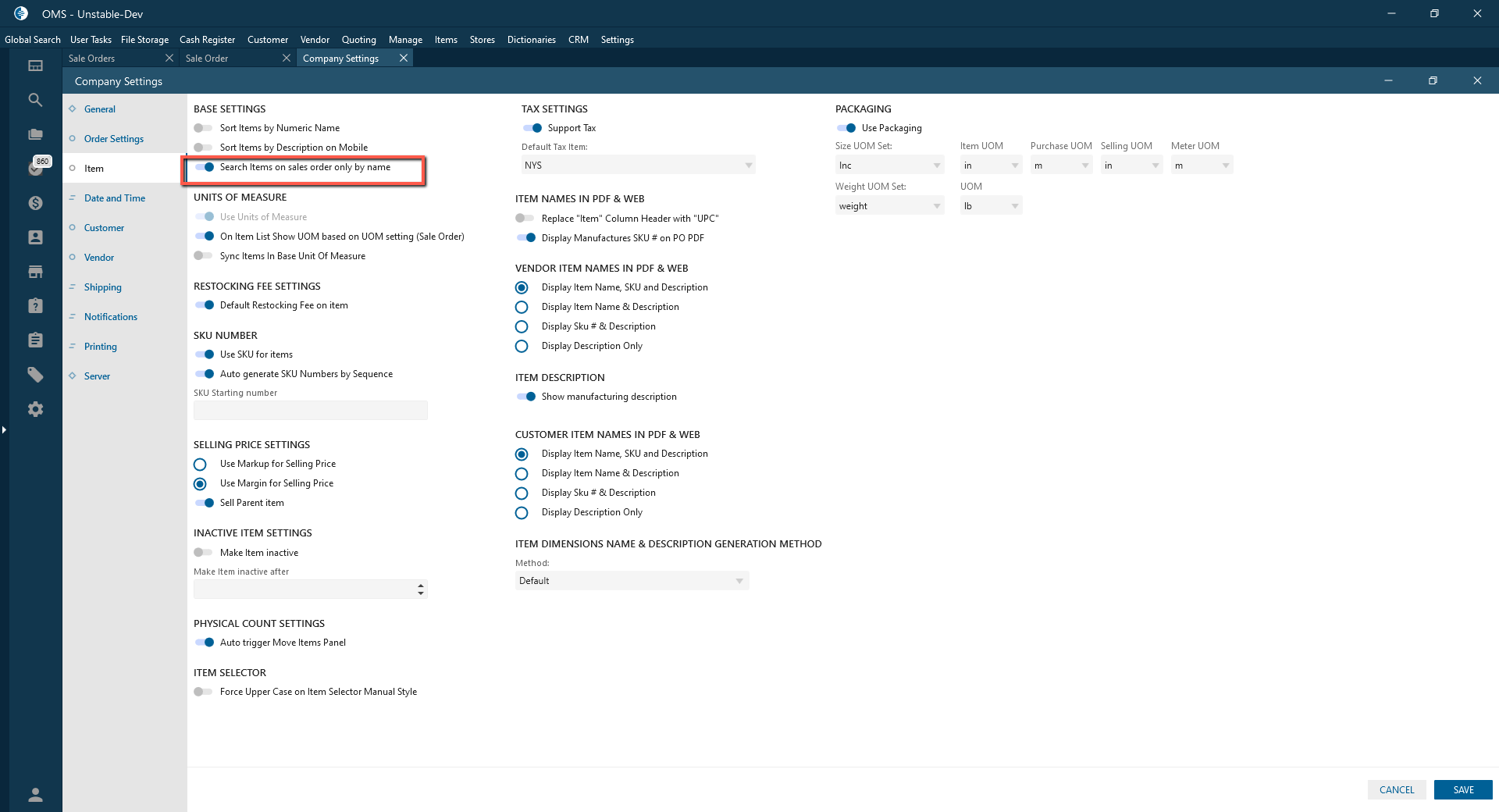 If the checkbox is checked -> In Sale Order item is searched only by item name.