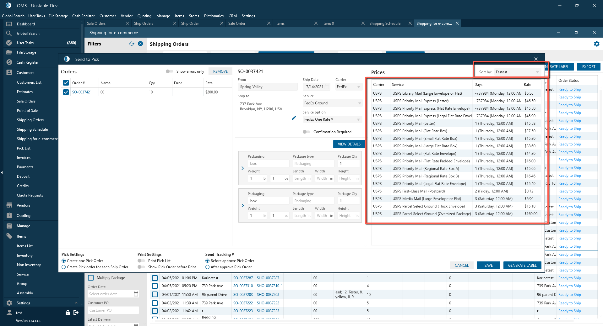 On the Send to Pick pop-up were added Carrier Rates. The List of Prices is displayed after filling the next parameters: