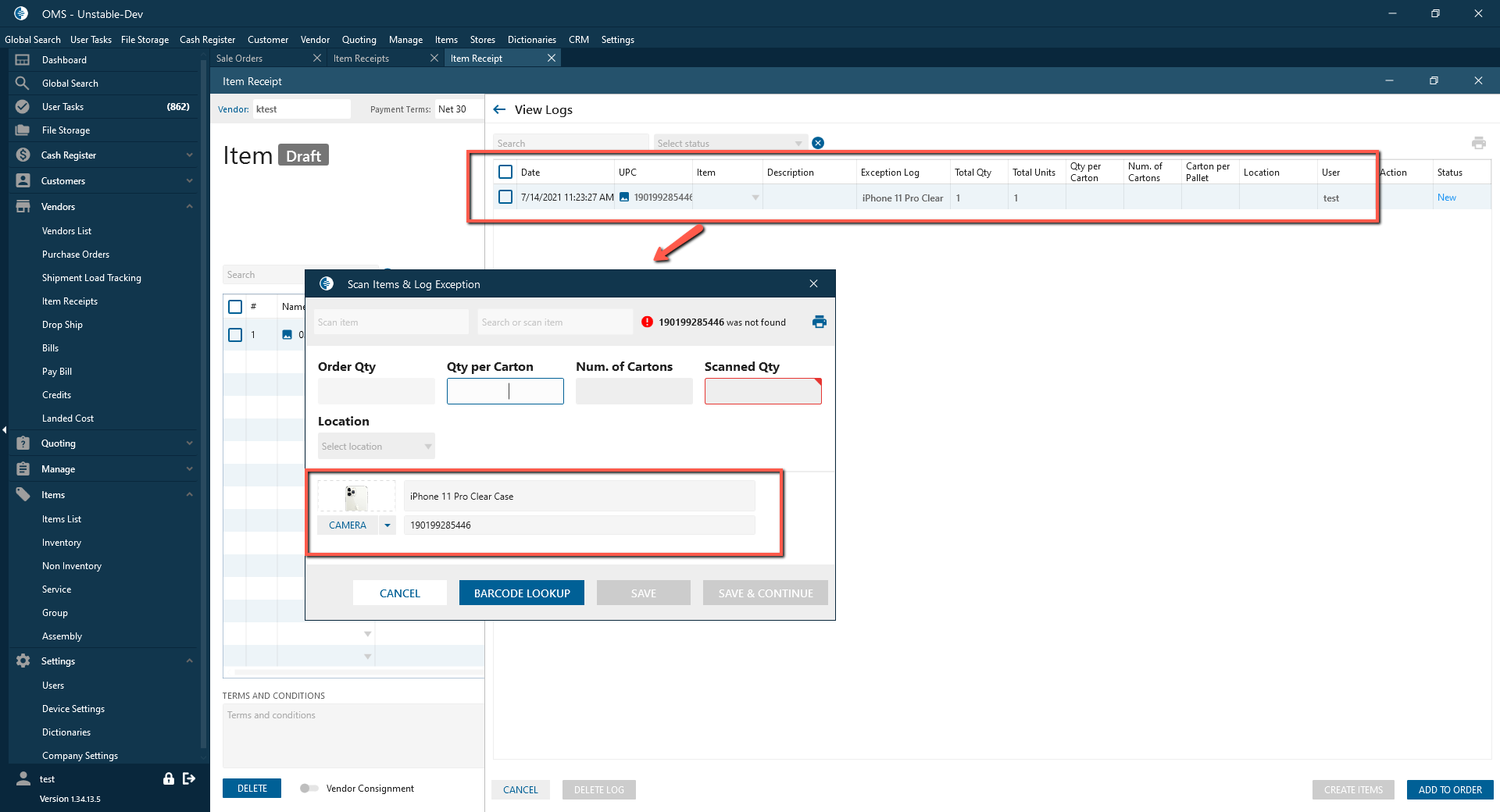 Scan Items & Log Exception pop-up: