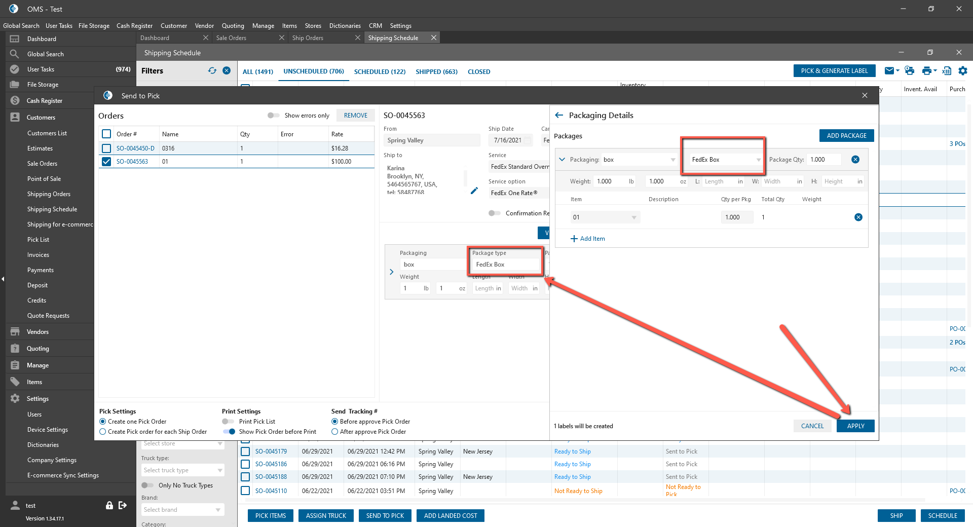 After entering Package Type on the Packaging Details panel, the selected Package Type is displayed on Send to Pick form.