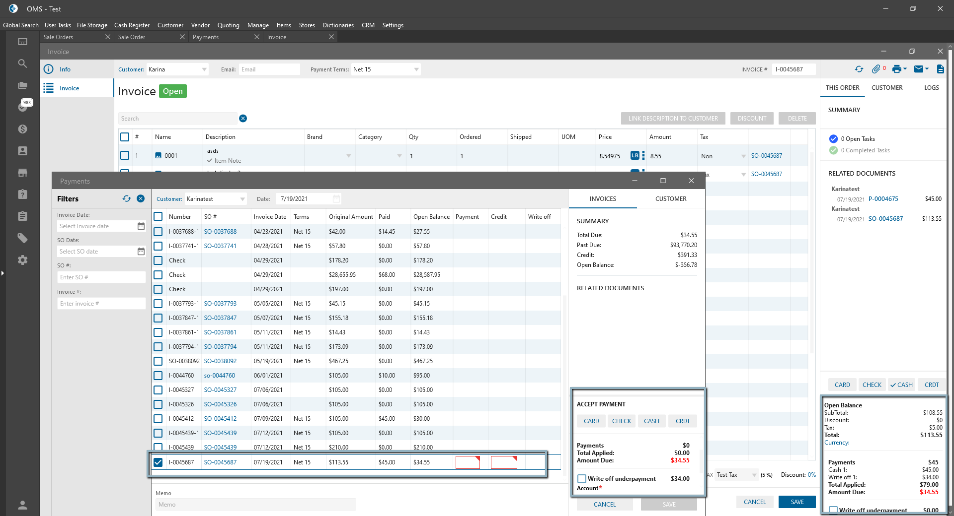 - Open Payments list, select Customer, find created Invoice -> Add some Payment and Write Off;