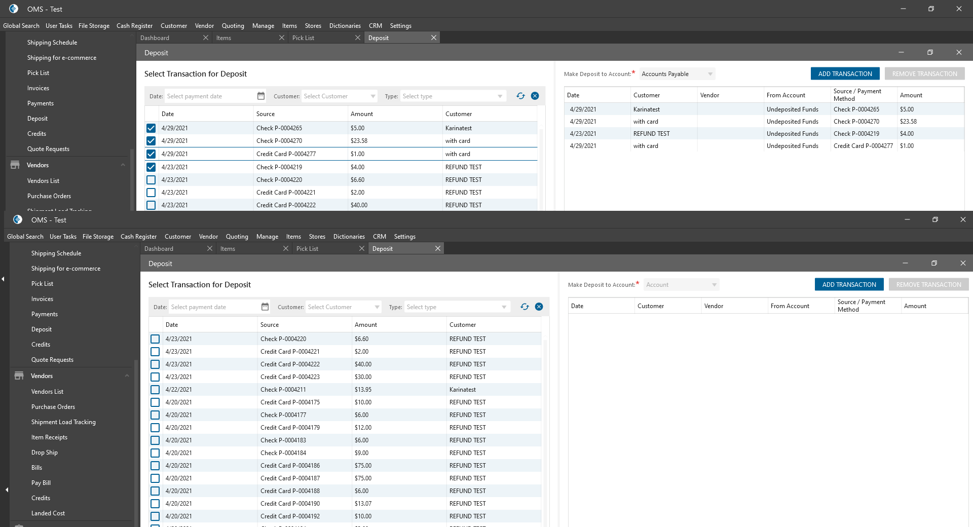 The Deposit panel is opened and refreshed
