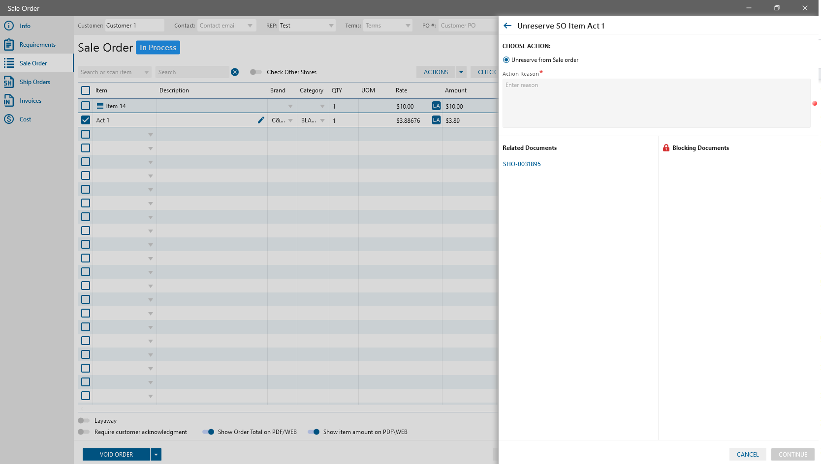 After clicking “Continue” Item status in SO will be changed and specified Items unreserved. After undeserving Qty will be unallocated to the Store. If there are related PO requests then these requests will be deleted automatically. If there are related POs then Item Qty in related SO will be unlinked from these POs. After unreserving corresponding log will be added to SO.