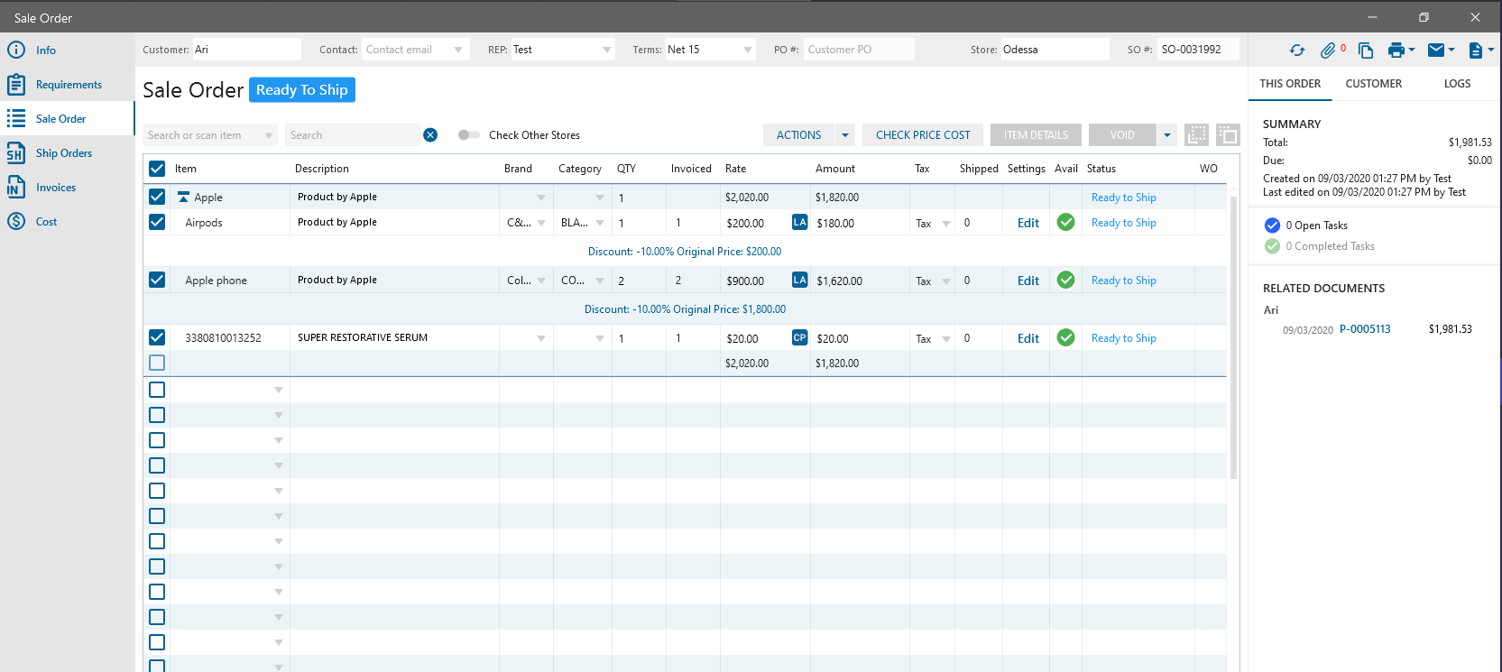 - Create SO, add group Item and some Inventory Items ⇒ Save&Process