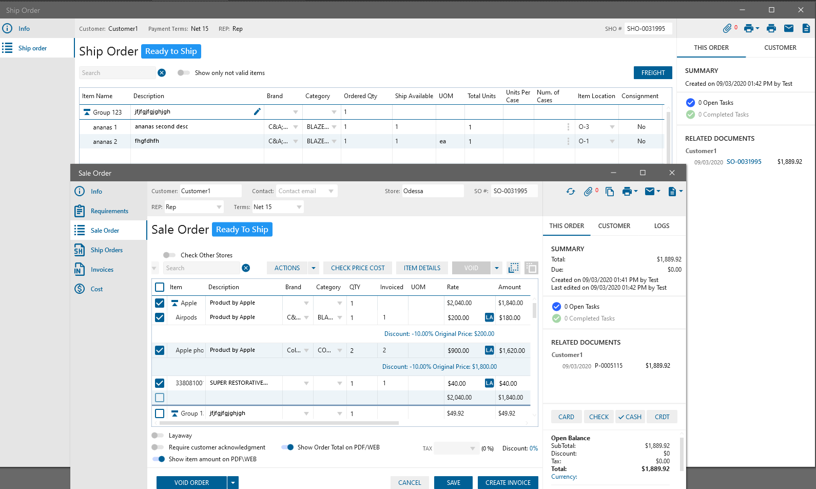 - Reopen SO, check one group Item → Create Invoice(in pop-up select NO)