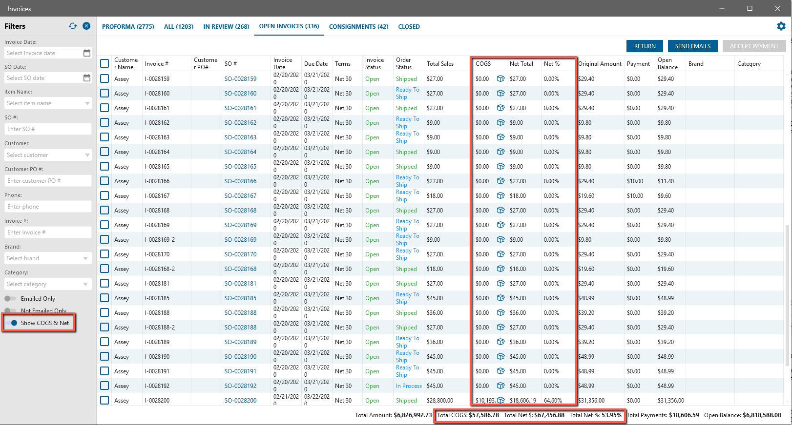 To view this calculations User has to switch on “Show COGS and Net” checkbox in the filter panel: