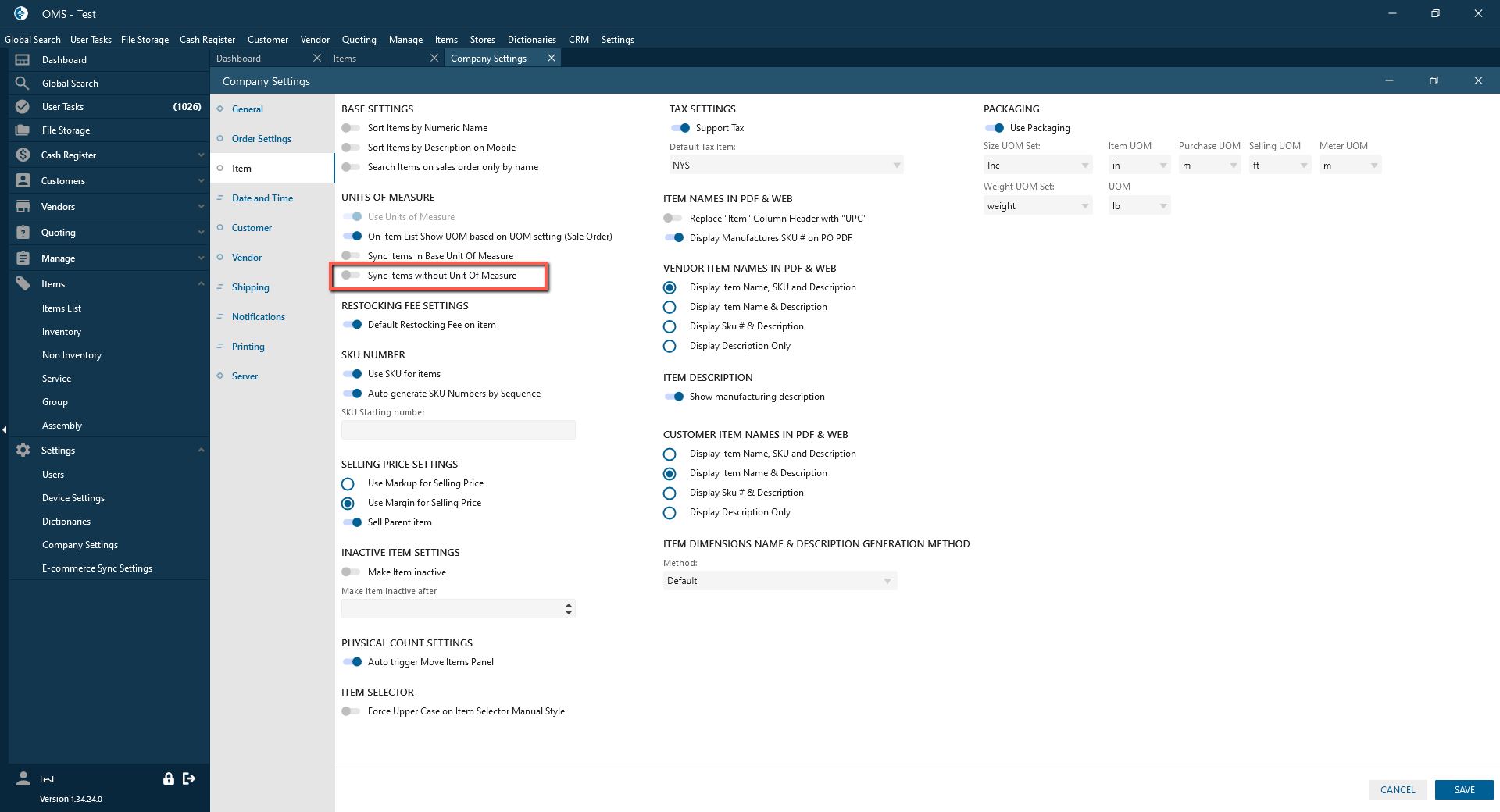 “Sync Items without Unit Of Measure” checkbox