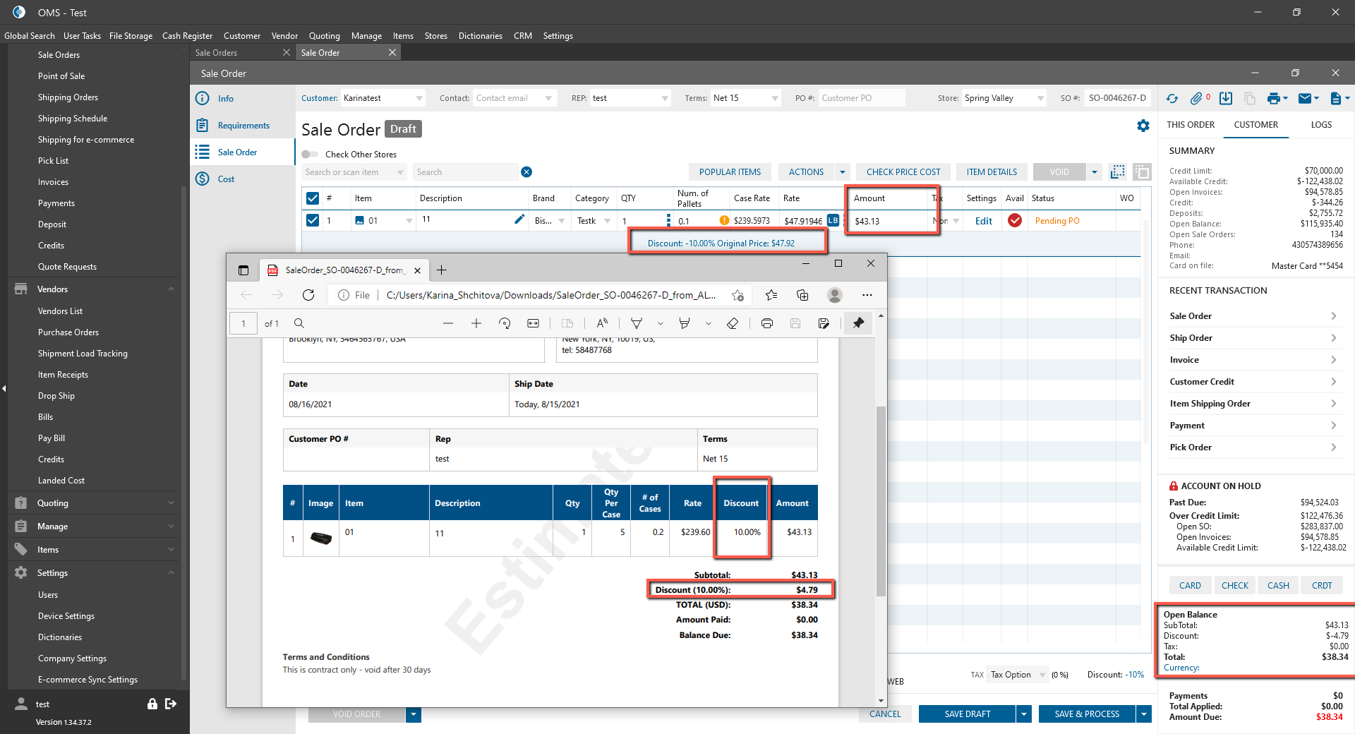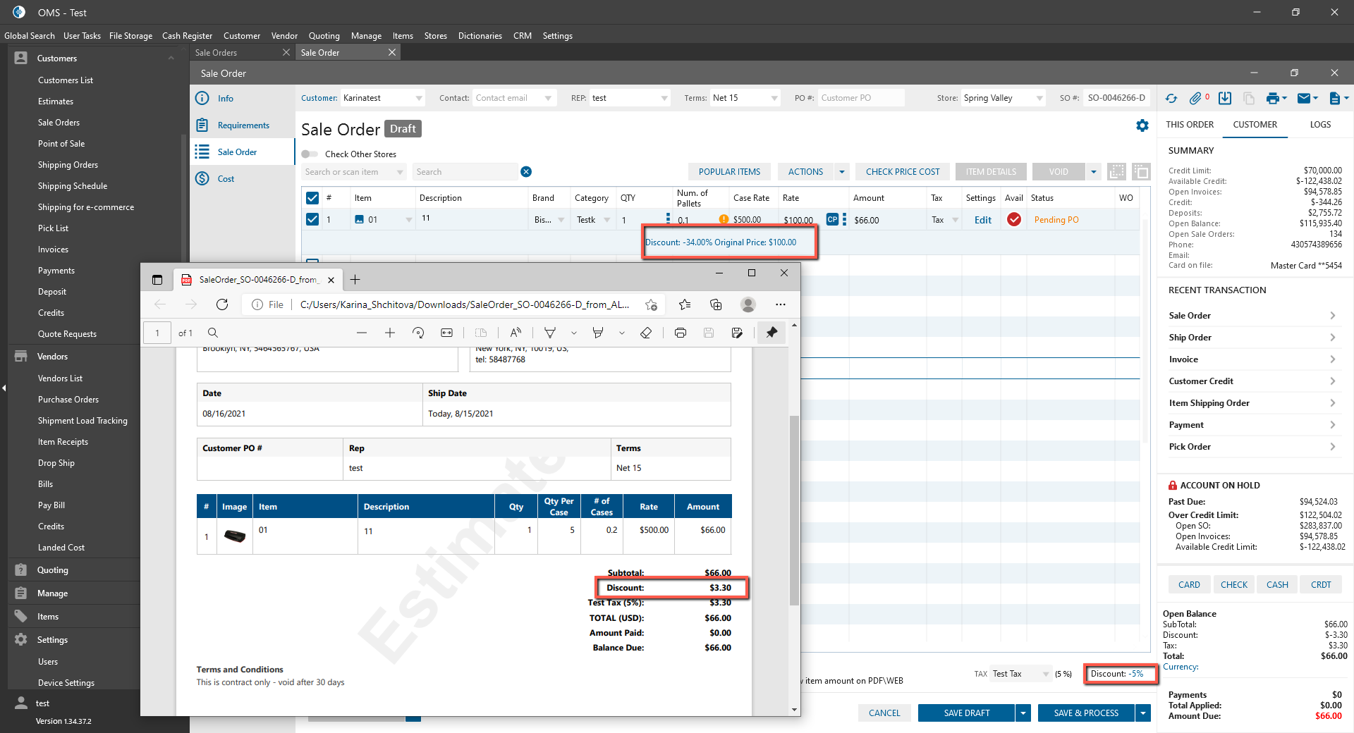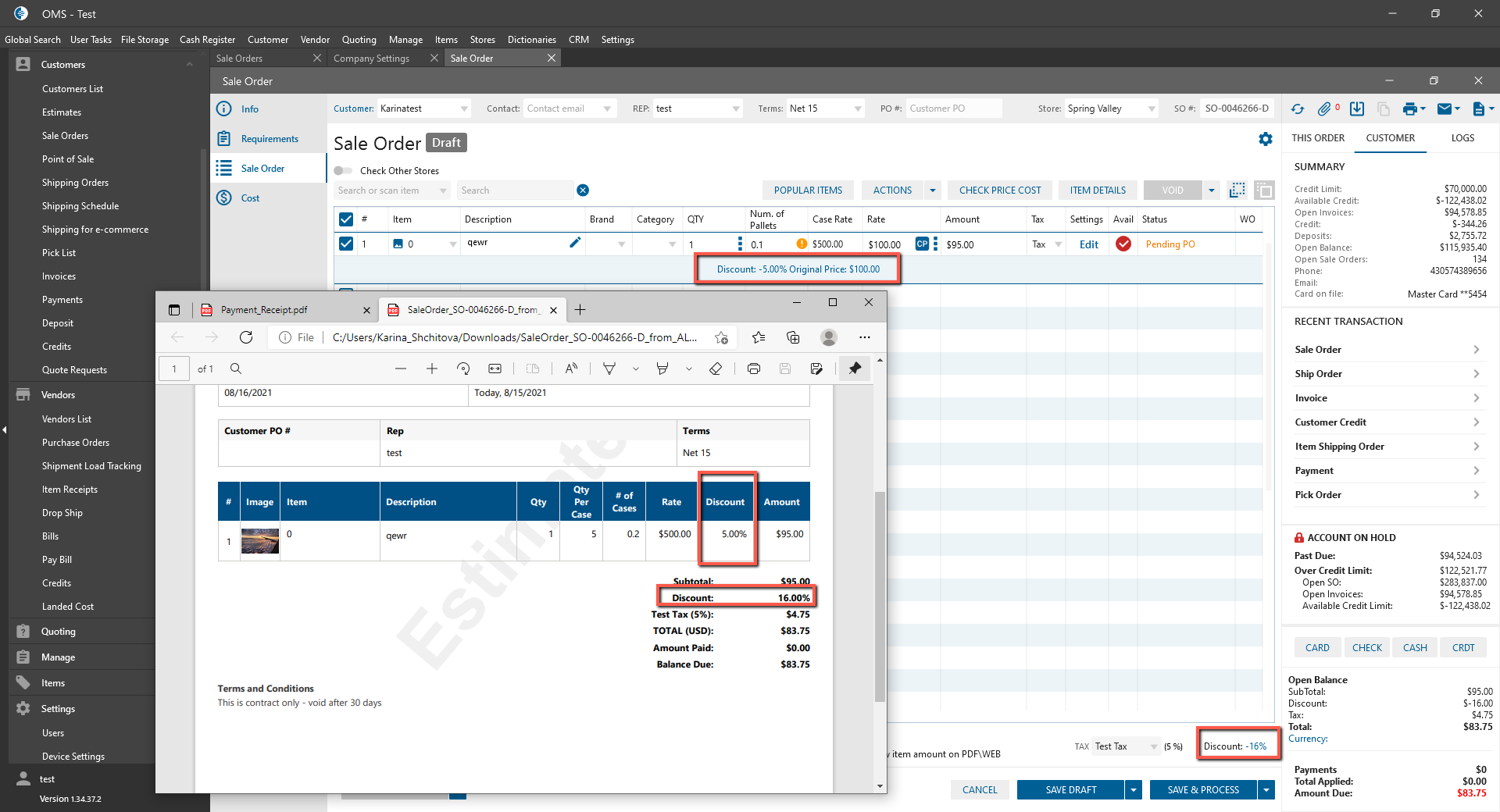 - If in Company Settings checked Show Discount % on PDF and Show Discount Amount on PDF at the same time.