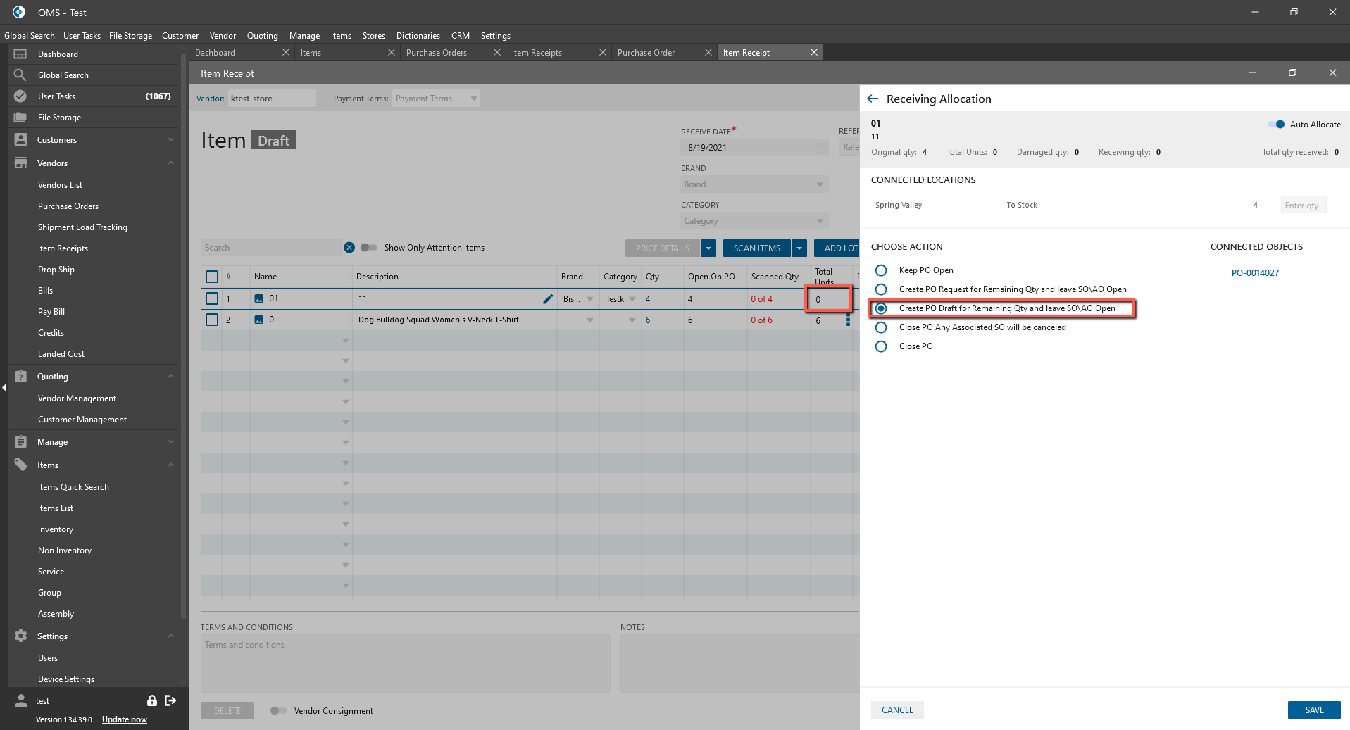 - Receiving Allocation panel opened -> Select “Create PO Draft for Remaining Qty and leave SO/AO Open” action -> Save;