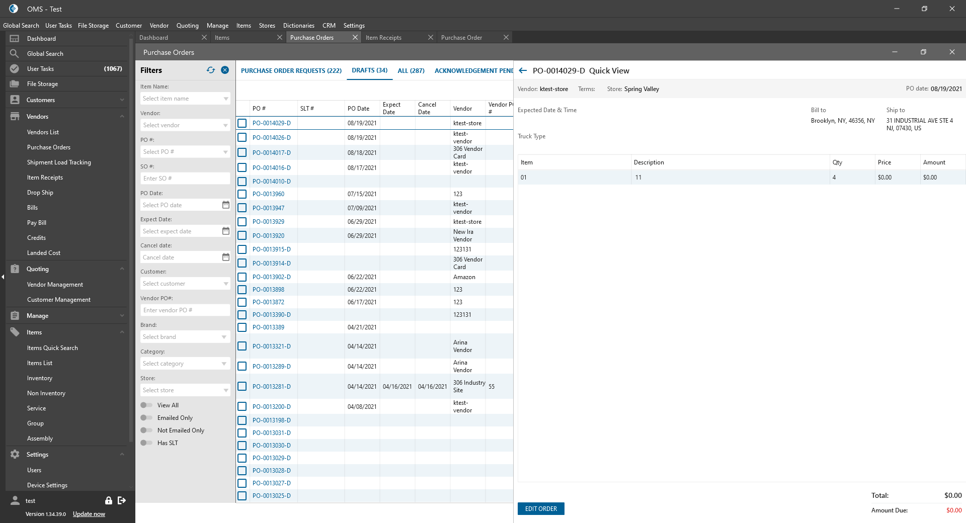 - Create Purchase Order -> Add items -> Save & Receipt;