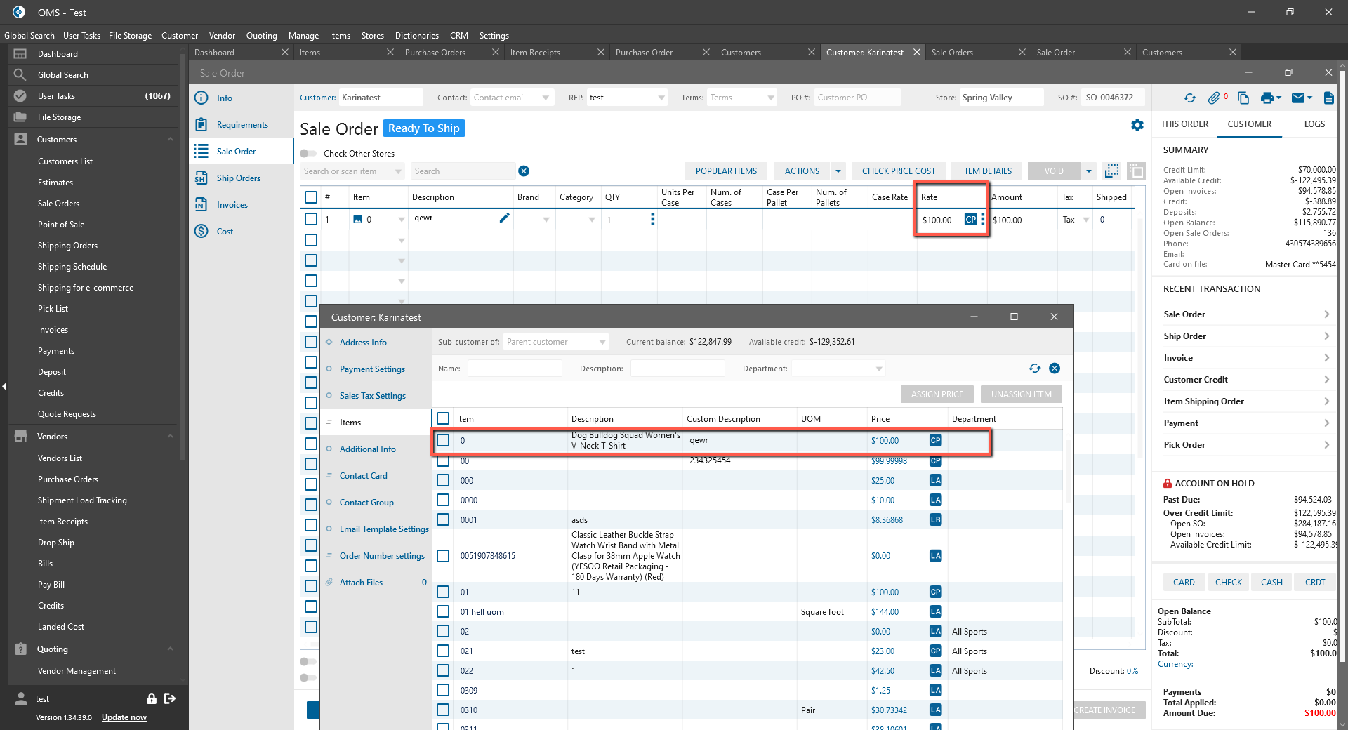 - Create Sale Order in app -> Add customer -> Add item with custom price -> Save;