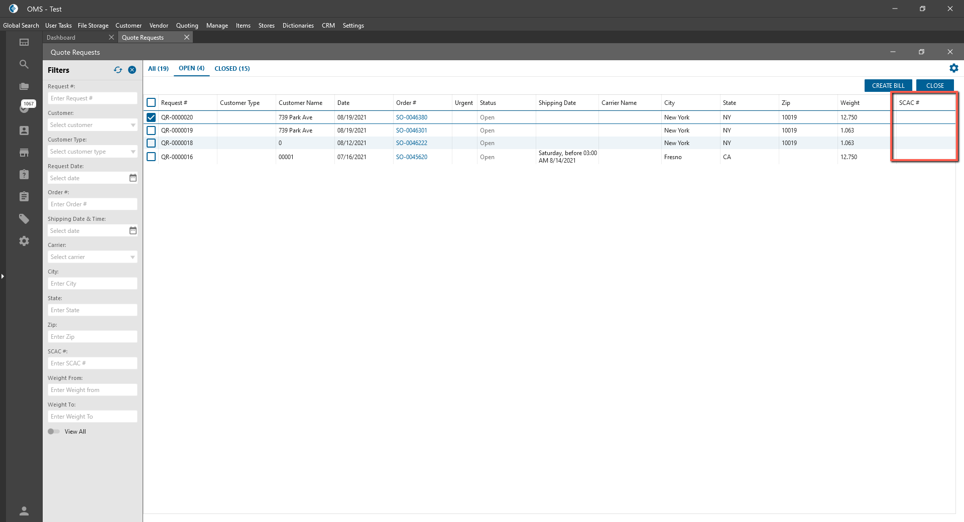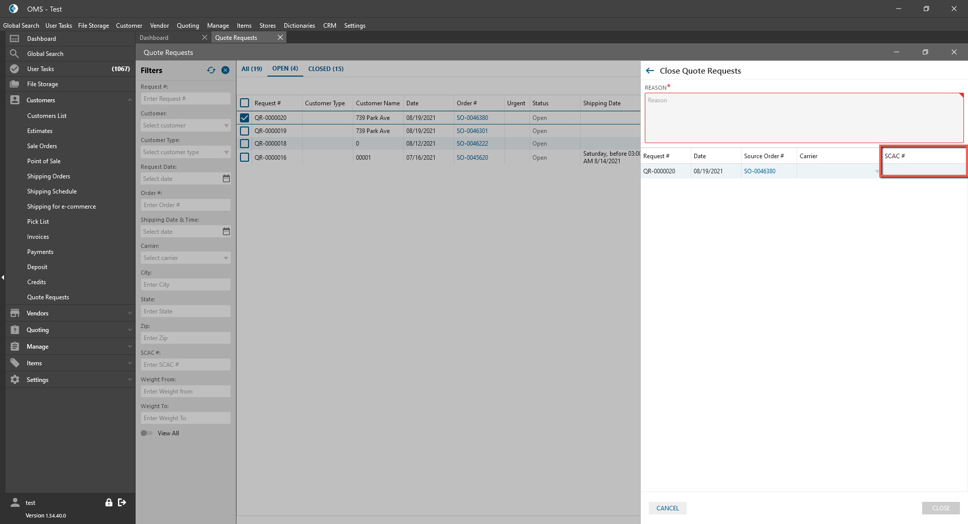 - Close Quotes Requests panel: