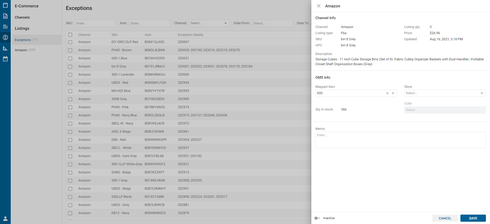 - if the user clicks on Save button -> item marked as “Mapped” and listing exception as “Resolved”;