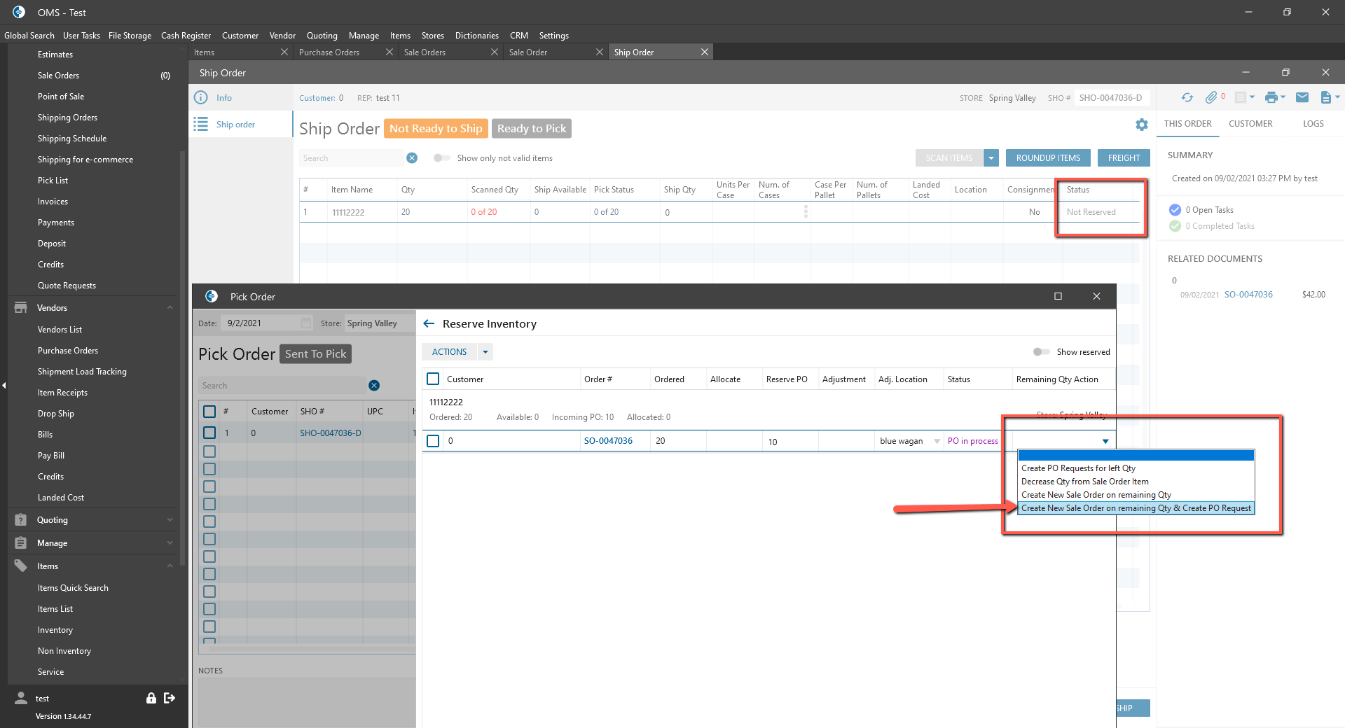If the user wants to pick Order with less Qty than in Sale Order -> On Reserve Inventory panel can select “Create New Sale Order on remaining Qty & Create PO Request” Remaining Qty Action.