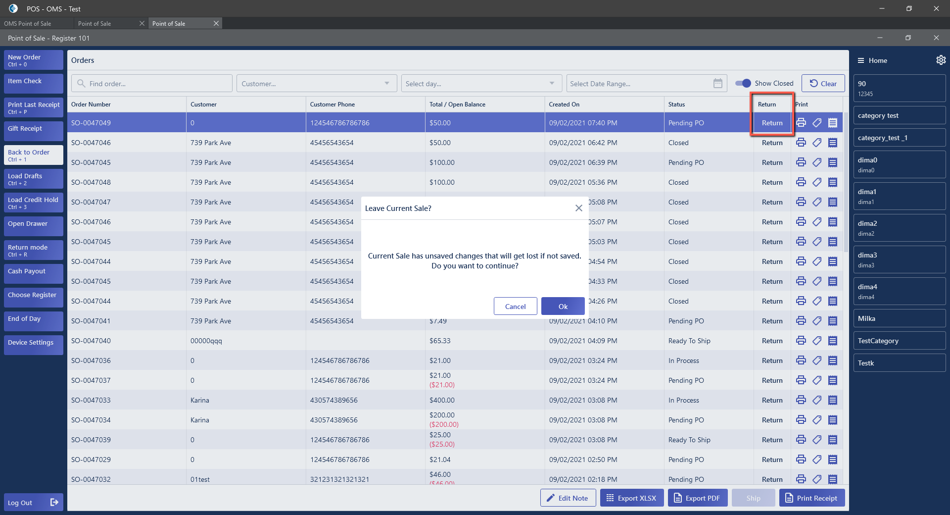 - Text: “Current Sale has unsaved changes that will get lost if not saved. Do you want to continue?”;