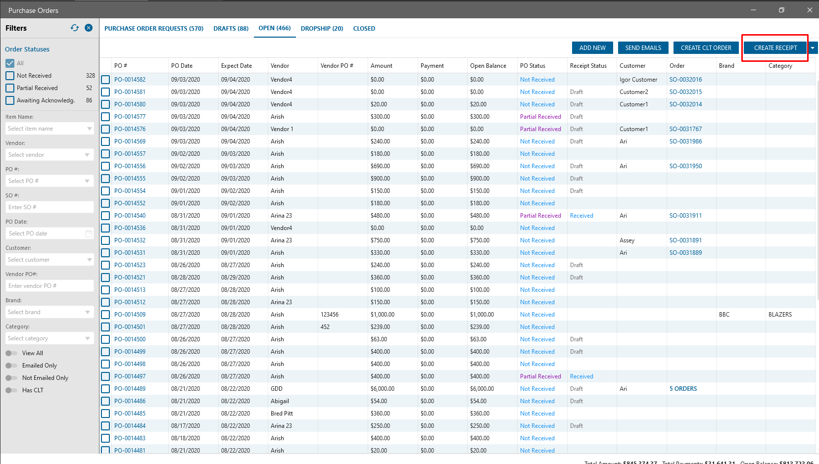 If Company Setting -> Order Setting -> Bucket Settings -> “Show buckets as tabs on SO/PO” checkbox is set off then on the PO list form “Create Receipt” button should be displayed.