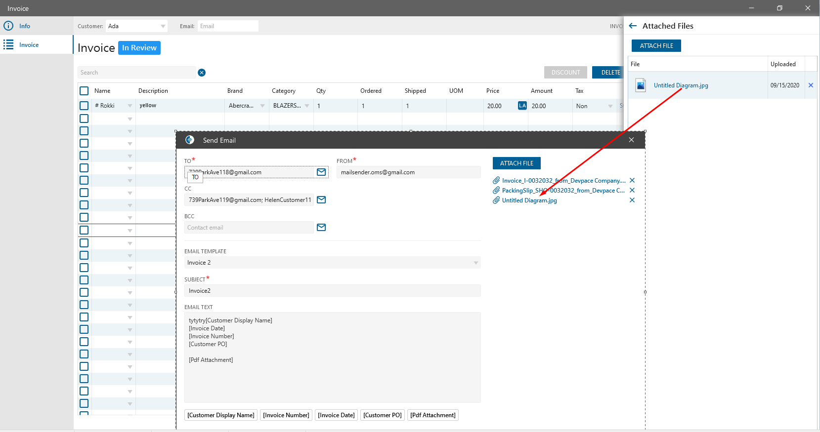 If the Invoice has an attachment, it is displayed on the Send Email panel in ATTACH FILE section.