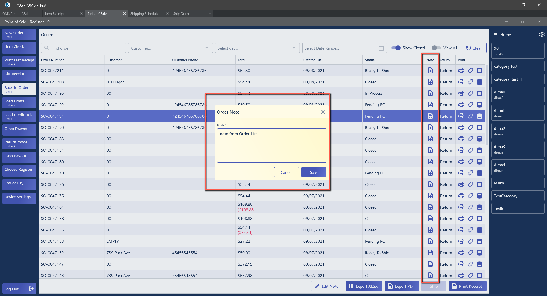 - after clicks on the icon in column -> Order Note pop-up opened;