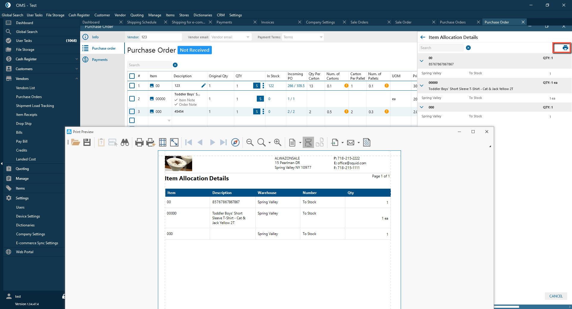 - After the user clicks on the button -> Print Order PDF with Item Allocation Details.