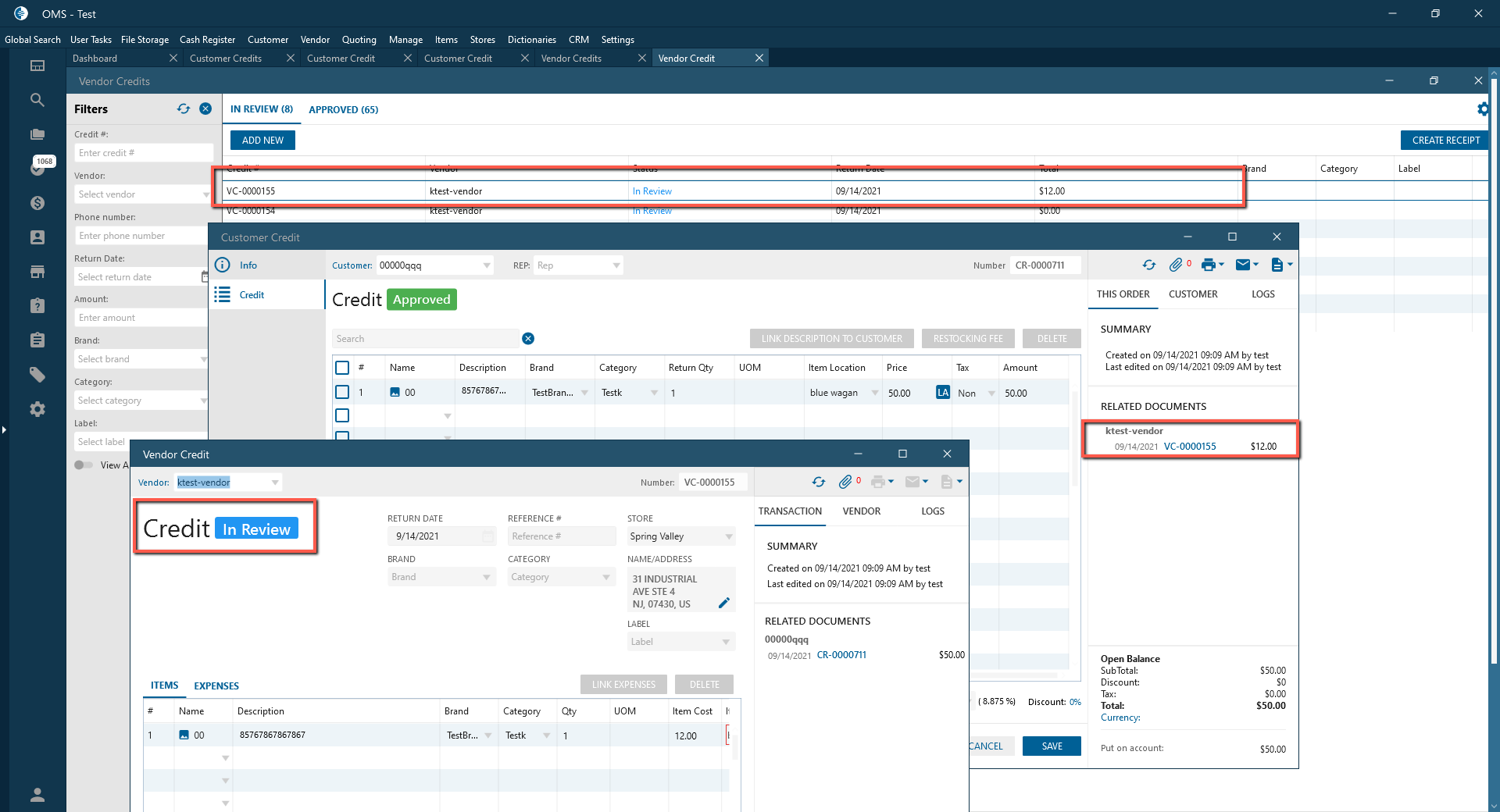 Vendor Credit is displayed on In Review tab.