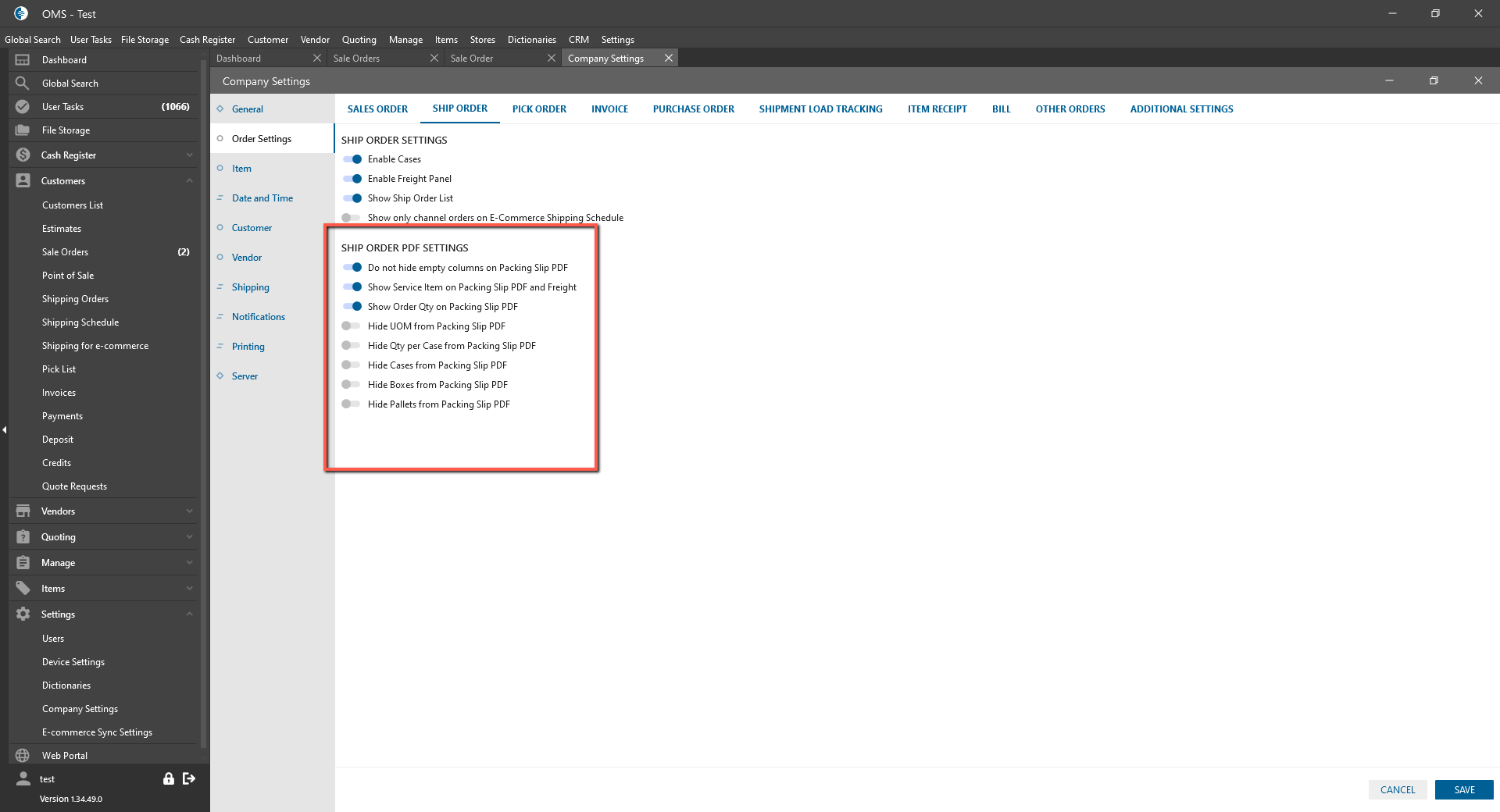 - Add Ship Order PDF Settings block with checkboxes listed below: