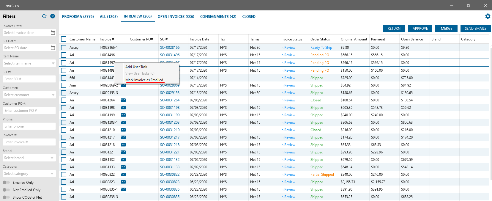 - “Mark Invoice as Emailed” is added to the context menu for Invoice