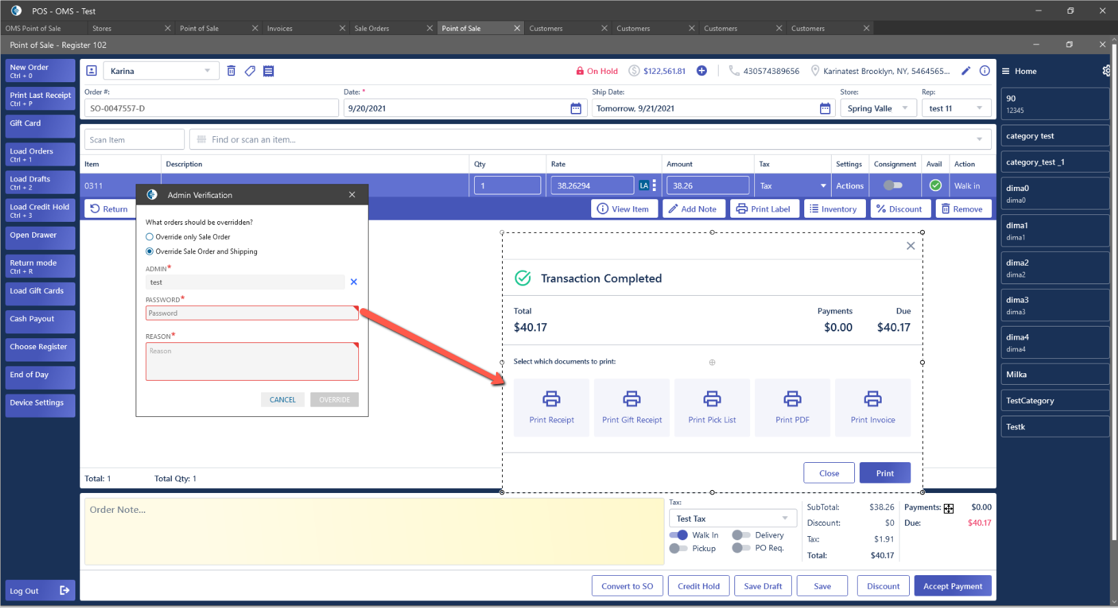 - after adding data to the Admin Verification pop-up and click the Override button -> display Transaction Completed pop-up;