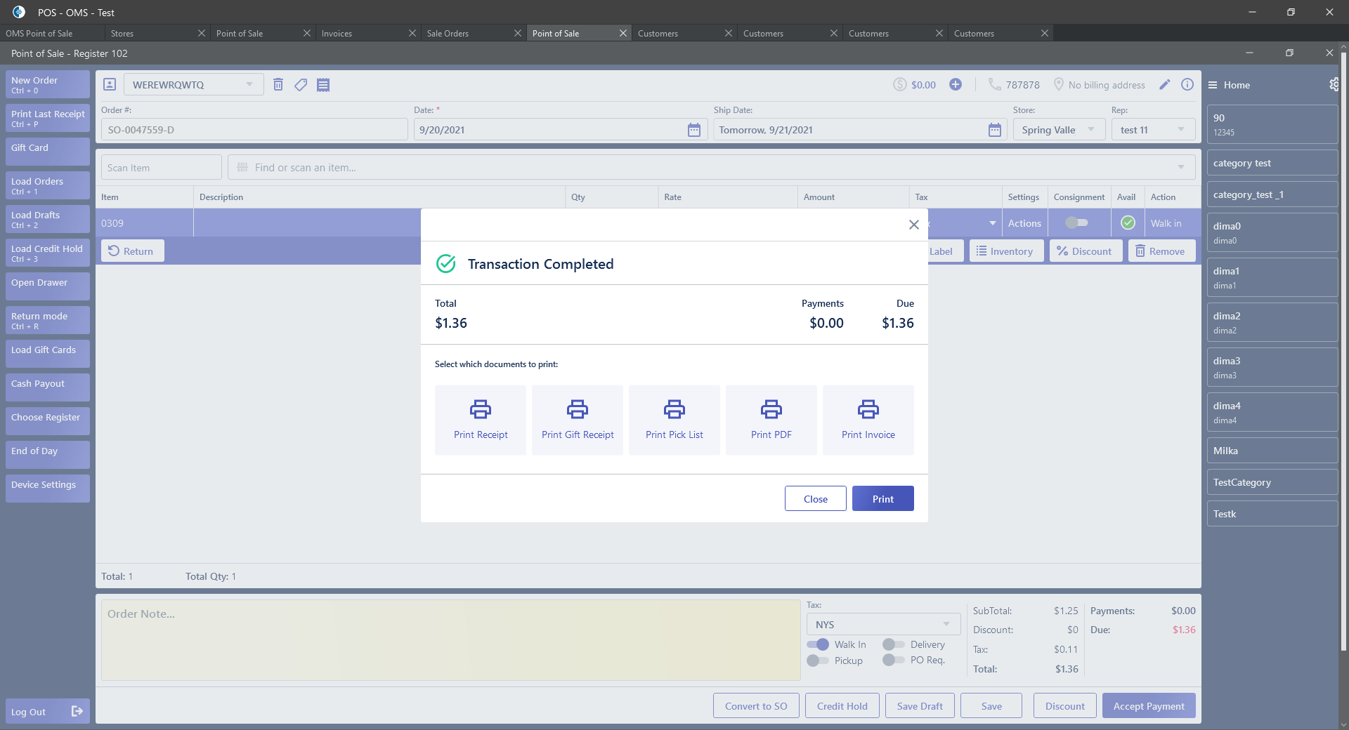 - If Customer is not over the credit or past due, and all Items in POS with Walk-in Action -> After clicking Account button displayed Transaction Completed pop-up;