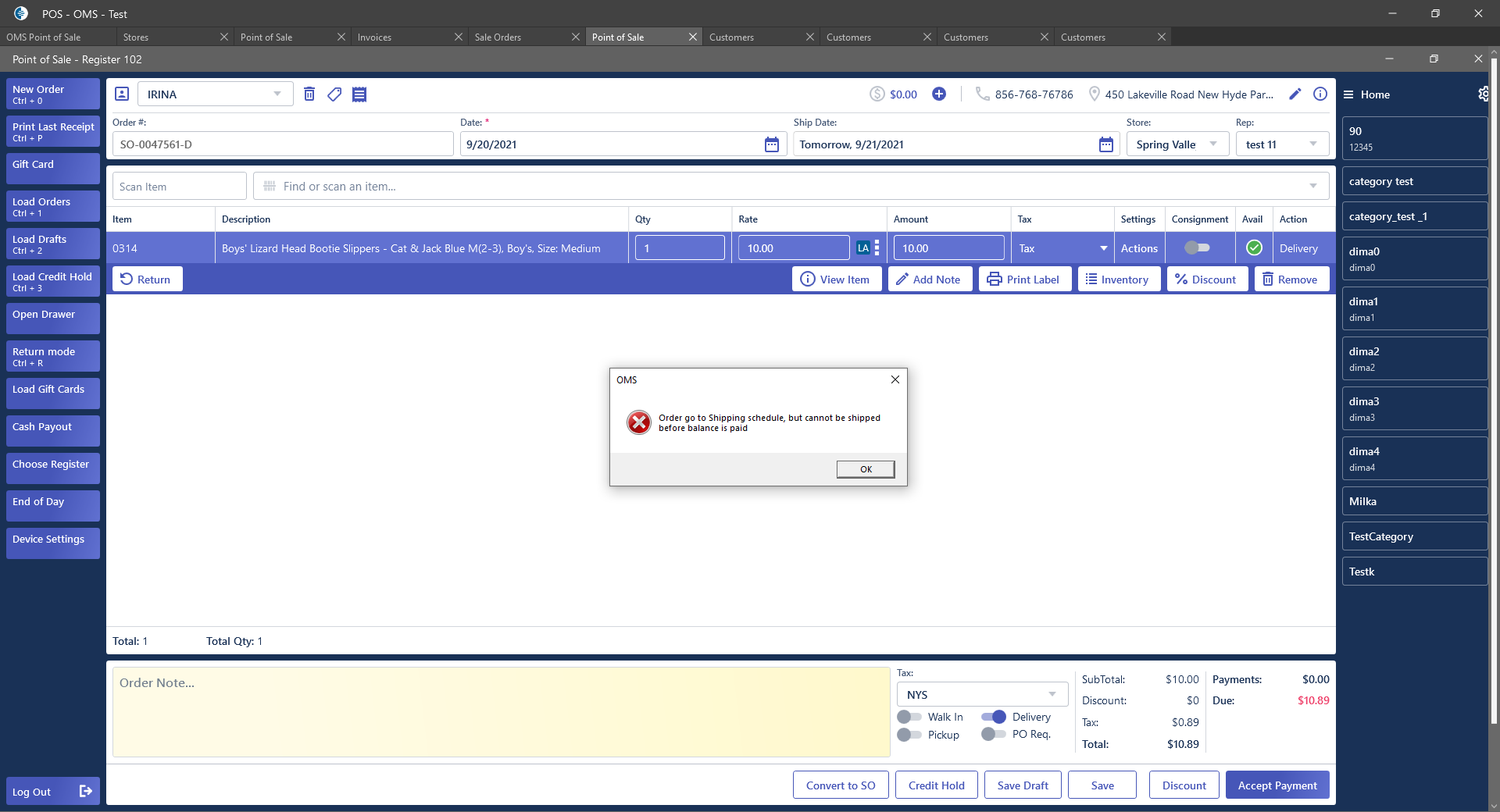 - If all Items in POS with Delivery Action -> After click on theĀ Account button displayed warning pop-up: “Order go to Shipping schedule, but cannot be shipped before balance is paid” with “OK” button.