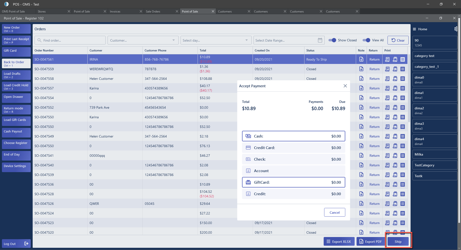 - If selected Order in Ready to Ship status, after click on the Ship button -> displays Accept Payment pop-up;