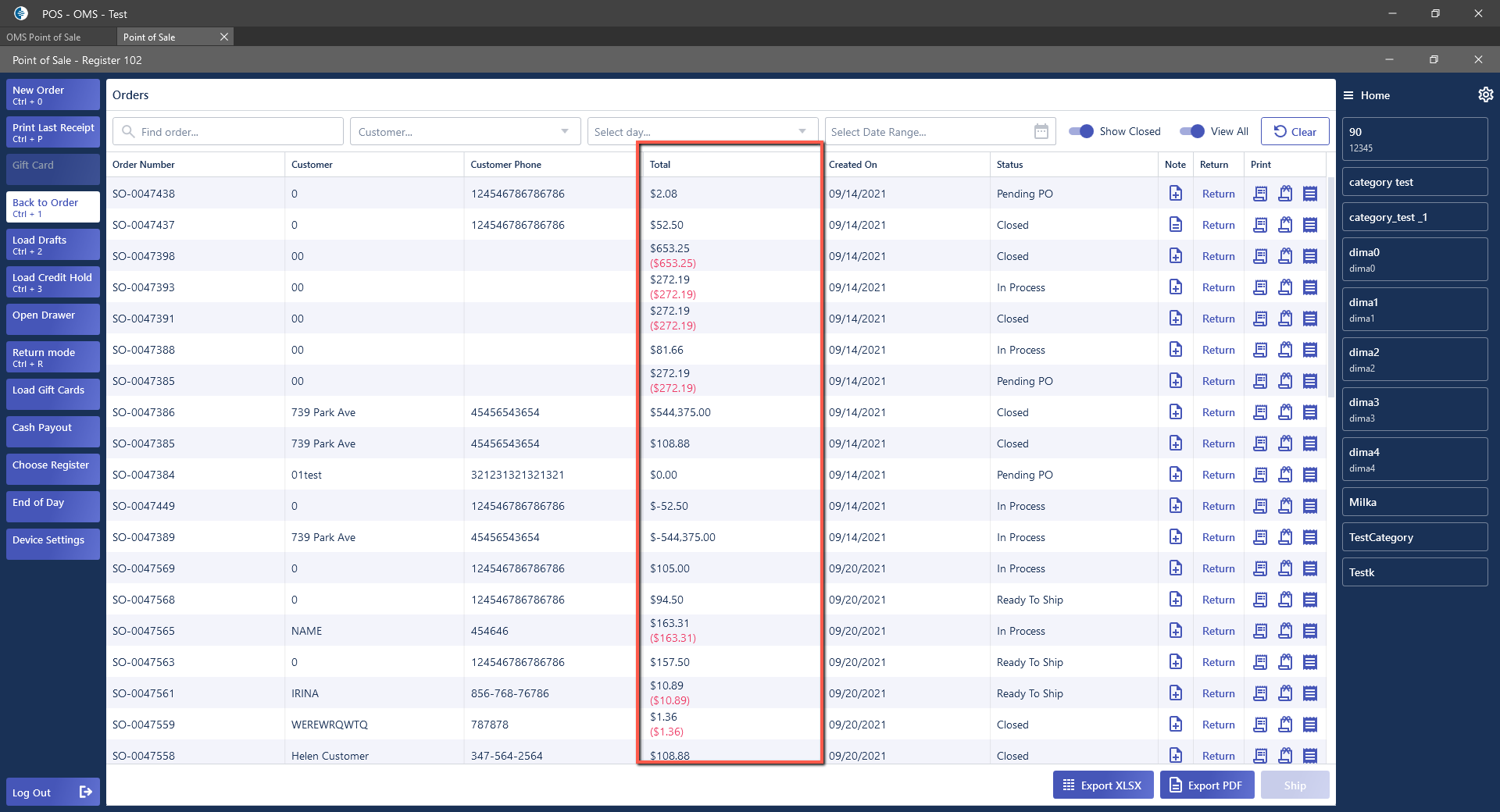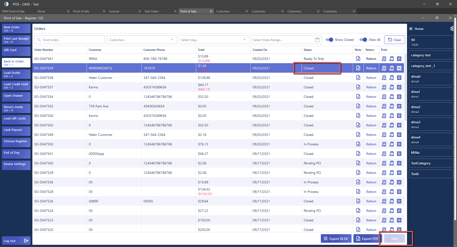 - If selected Order in statuses: Closed, in Process, Pending PO -> Ship button is disabled;