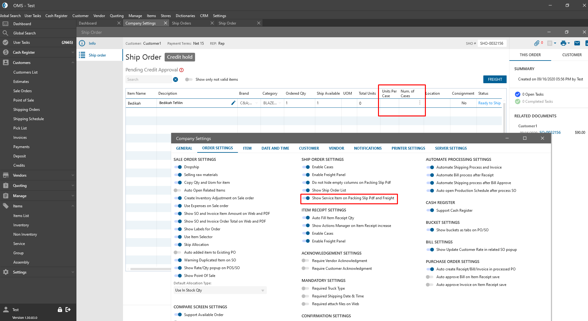 After setting the option on, Service Items are displayed on SHO PDF and Freight Panel, “Unites per Cased” and “Number of Cases” fields are enabled for them