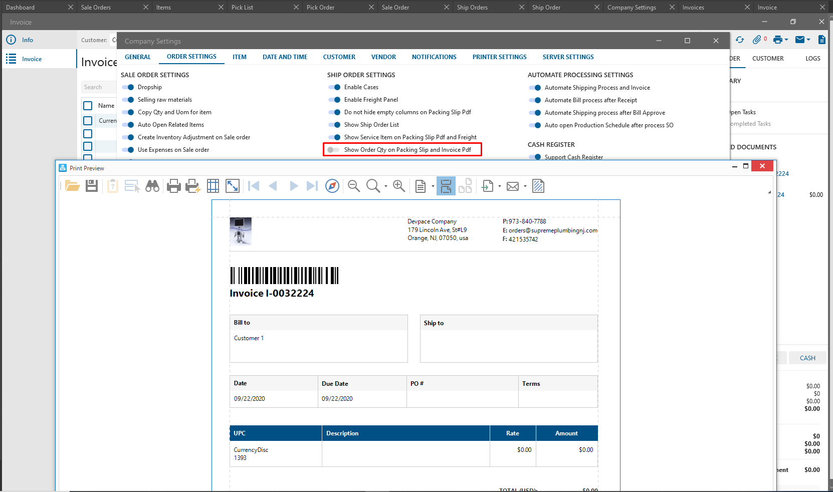 Company setting for showing or hiding order qty on the Packing Slip pdf and Invoice Pdf was added, to find the option go to:
