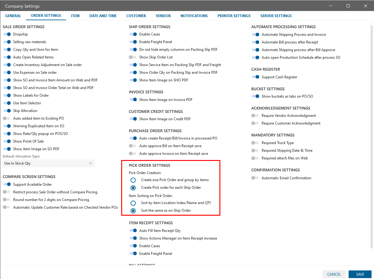 - to select options: “Create one Pick Order and group by items” (for all checked orders will be created common Pick Order) and “Create Pick order for each Ship Order”.