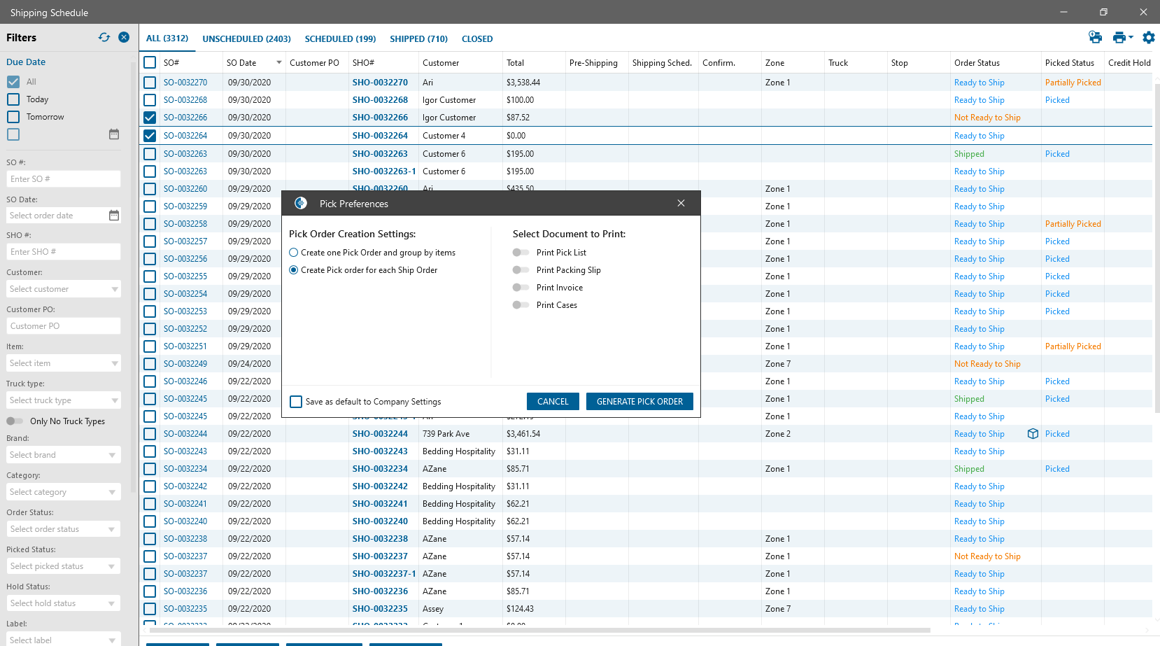 Added ability to create Pick Orders with options by added to the Shipping Schedule list form “Send to Pick” button. After clicking on the “Send to Pick” button, popup will be displayed.