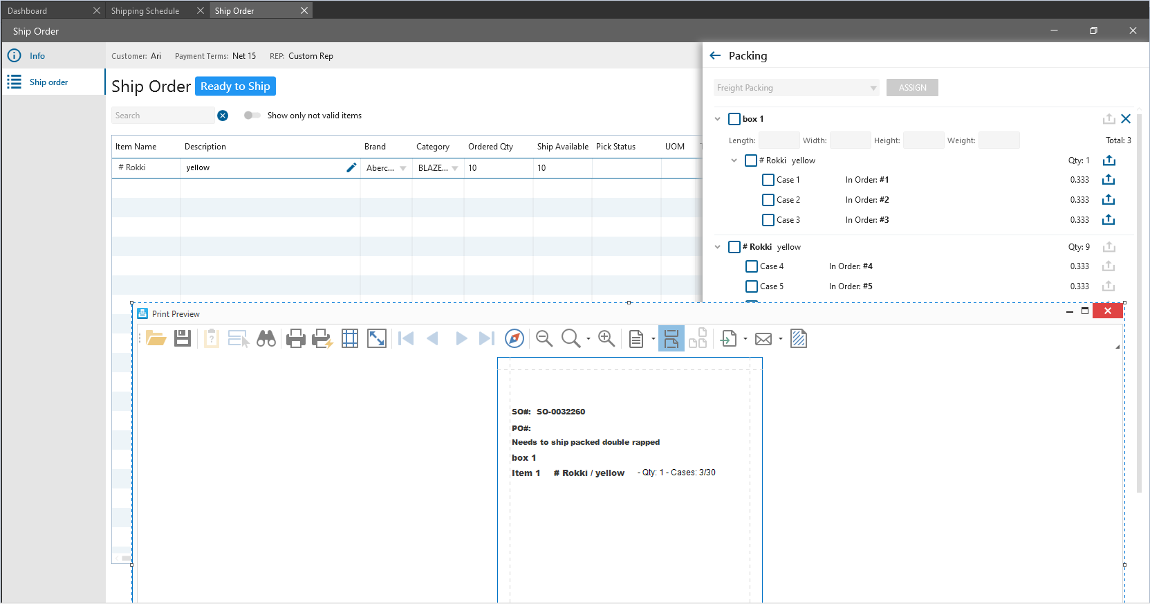 - In opening Packing Panel check 3 cases → Assign to Box → Close Panel