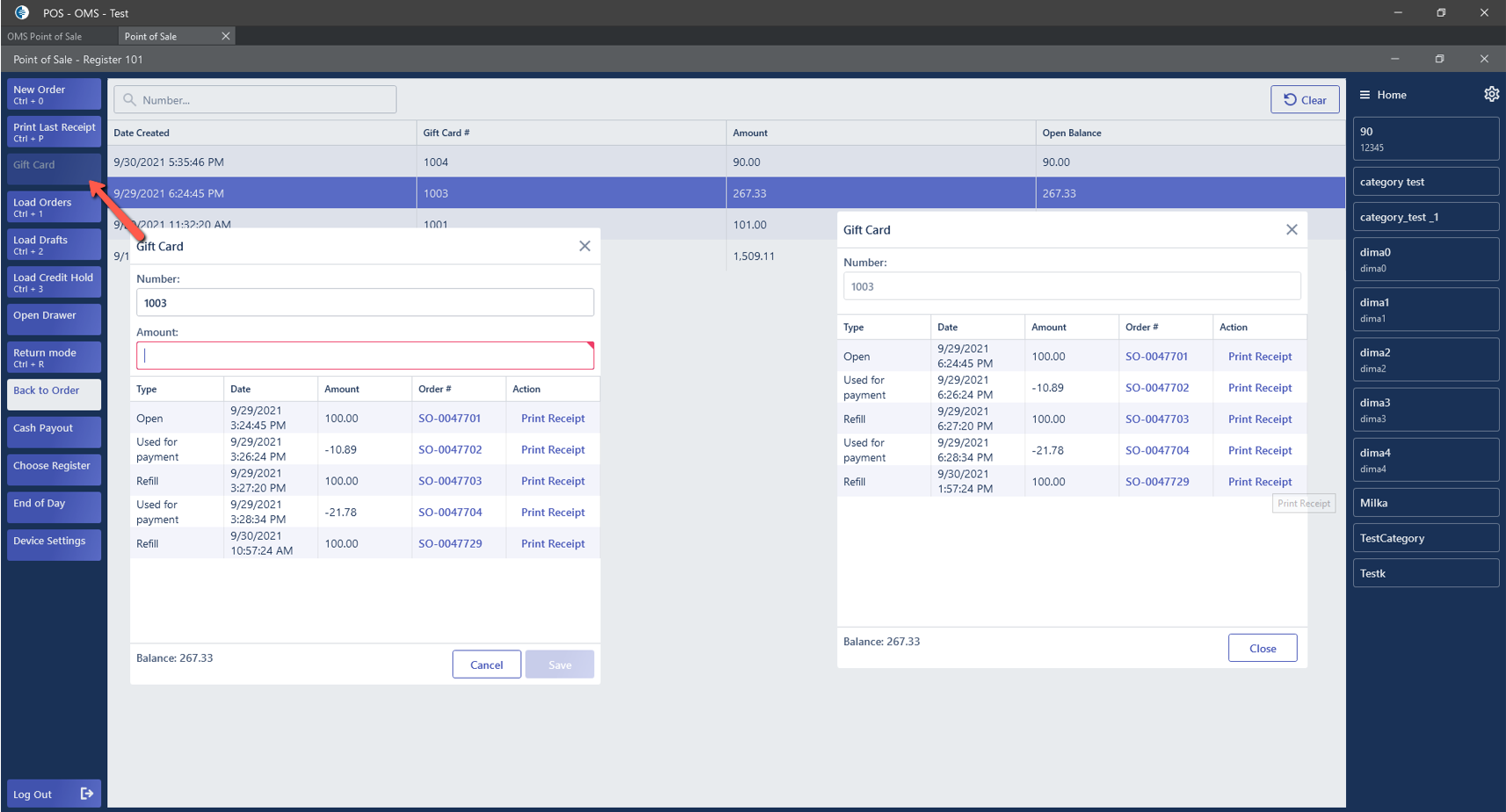 Open Balance from Gift Card is the same as in the Gift Card history from Gift Cards list.
