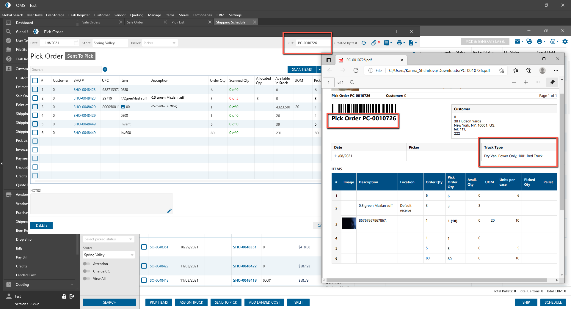 - If Pick Order contains items from different Ship Orders and in each SHO was selected Truck Type -> On the Pick Order PDF are displayed all Truck Types separated by a comma;