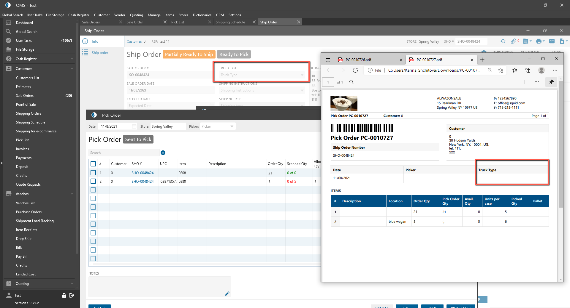 - If In the Ship Order wasn’t selected Truck Type -> on the Pick Order PDF field is empty.