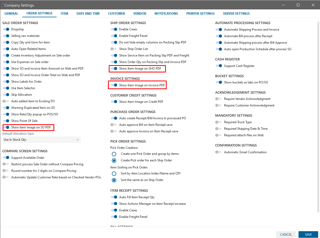 Settings for the displaying images on the Orders pdf have been added: