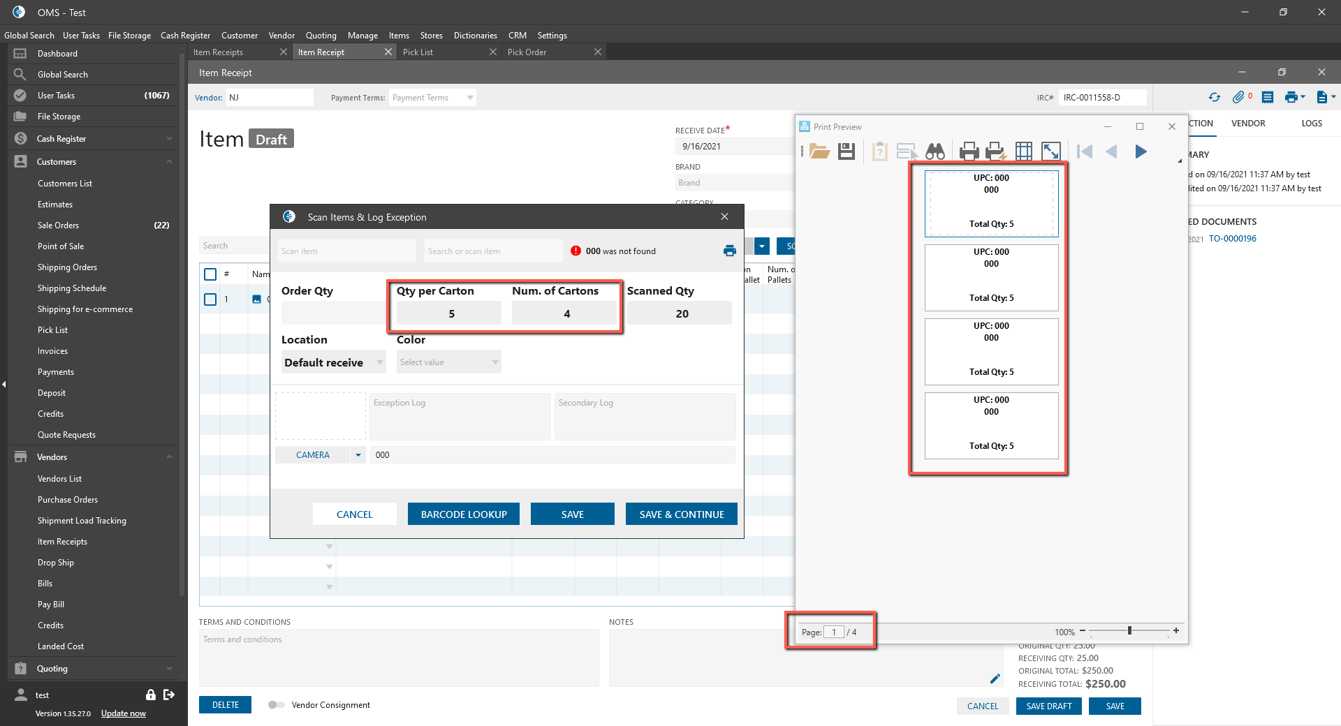- if the item was scanned and the user filled Qty per Carton and Num/ of Cartons -> Receiving label is printed based on Num. of Cartons.
