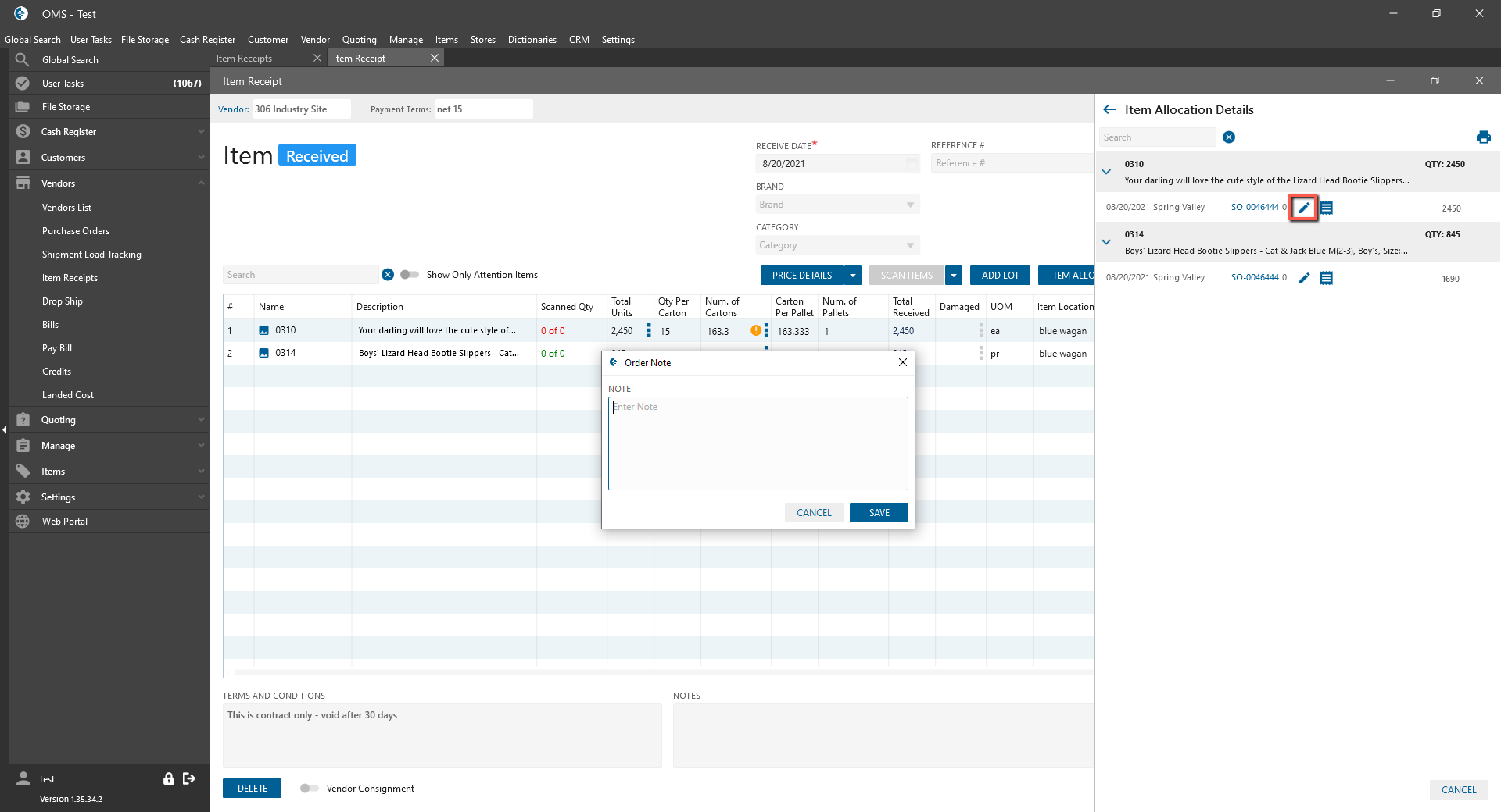 - after clicking on the pencil icon -> Order Note pop-up is opened: