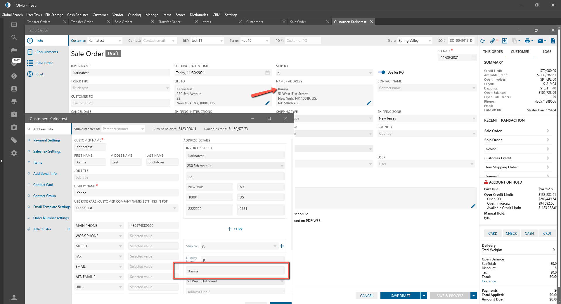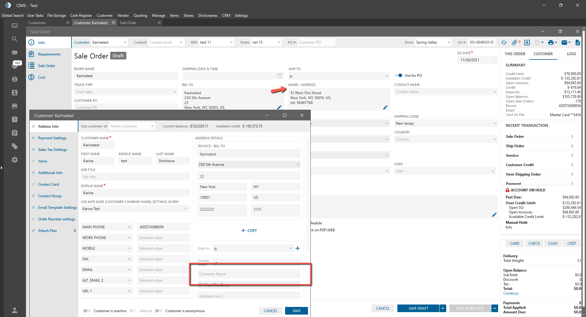 - for the selected customer in Order -> Ship To Customer Name is displayed in Name / Address textbox from Customer edit form;
