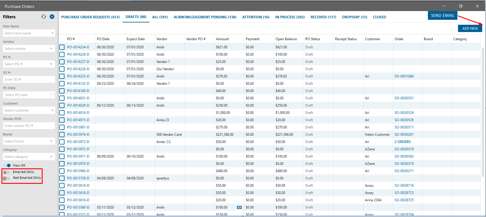 - SEND EMAIL button added on the Purchase Orders form