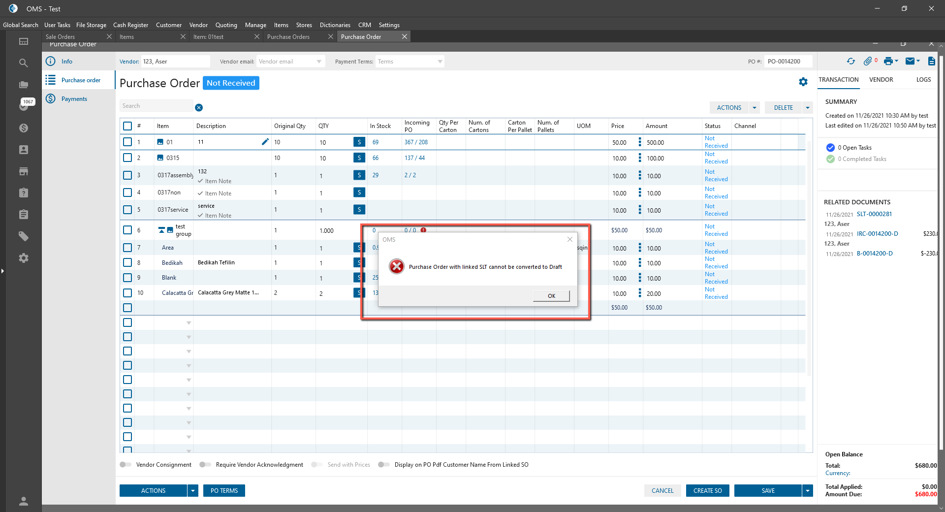 - Text: “Purchase Order with linked SLT cannot be converted to Draft”;