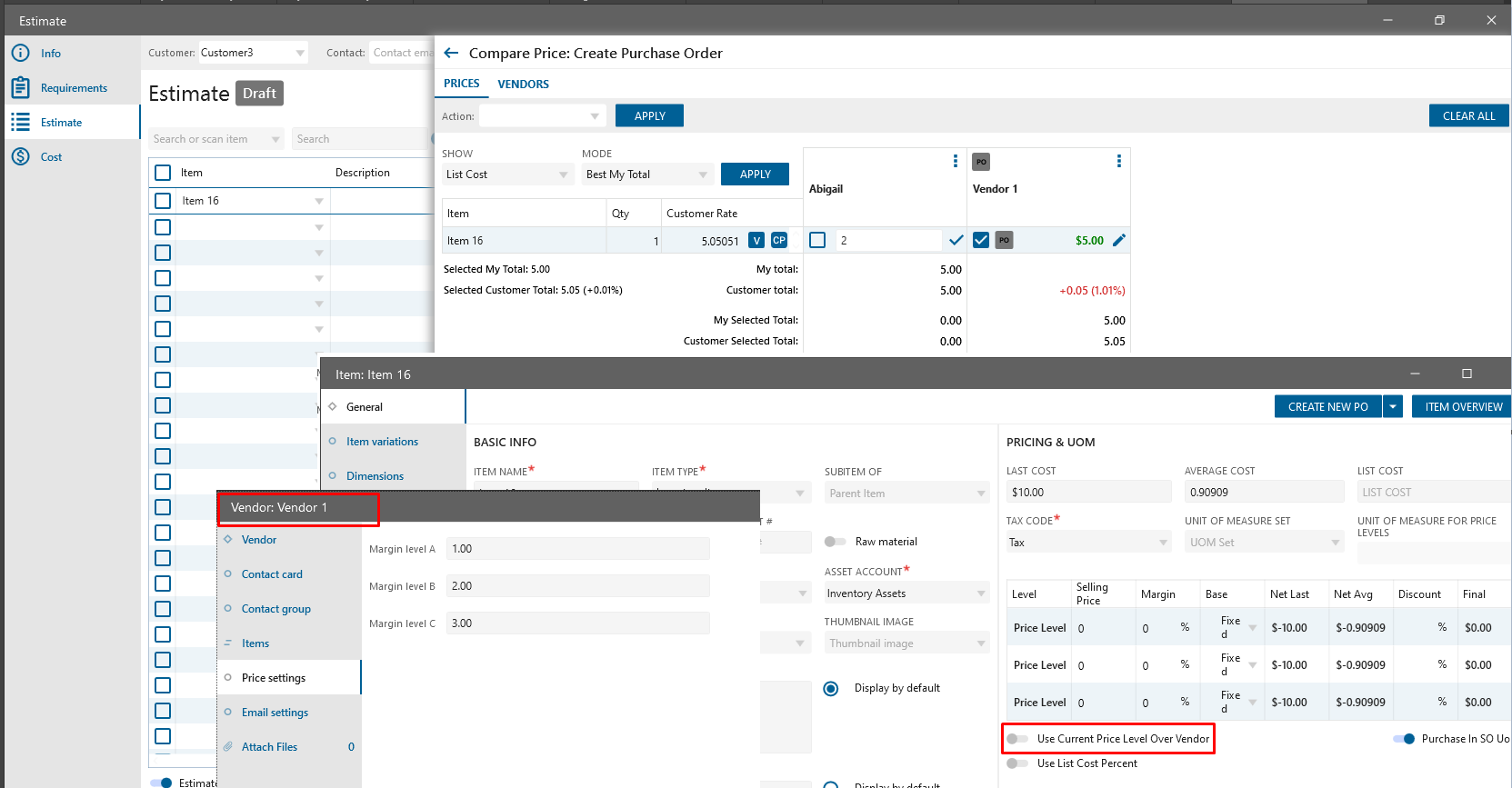 If on the Item edit form hasn’t been checked on the setting “Use Current Price Level Over Vendor” and On the Vendor edit form on the “Price Settings” tab have been added Margin/Markup Levels then On the Check Price Cost Panel of the Estimate edit form: Customer Rate should be counted and displayed with Vendor Margin/Markup.