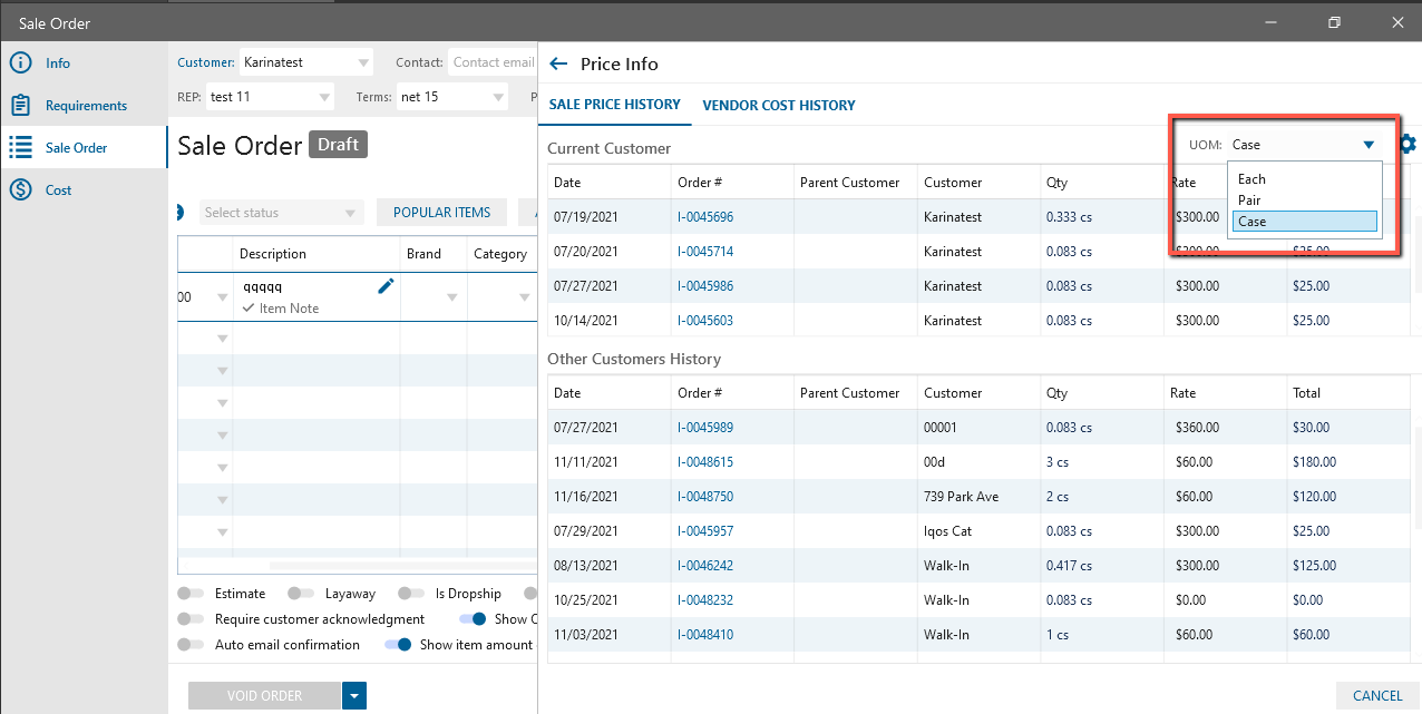 - If Order for the corresponding Customer was previously created with UOM item:
