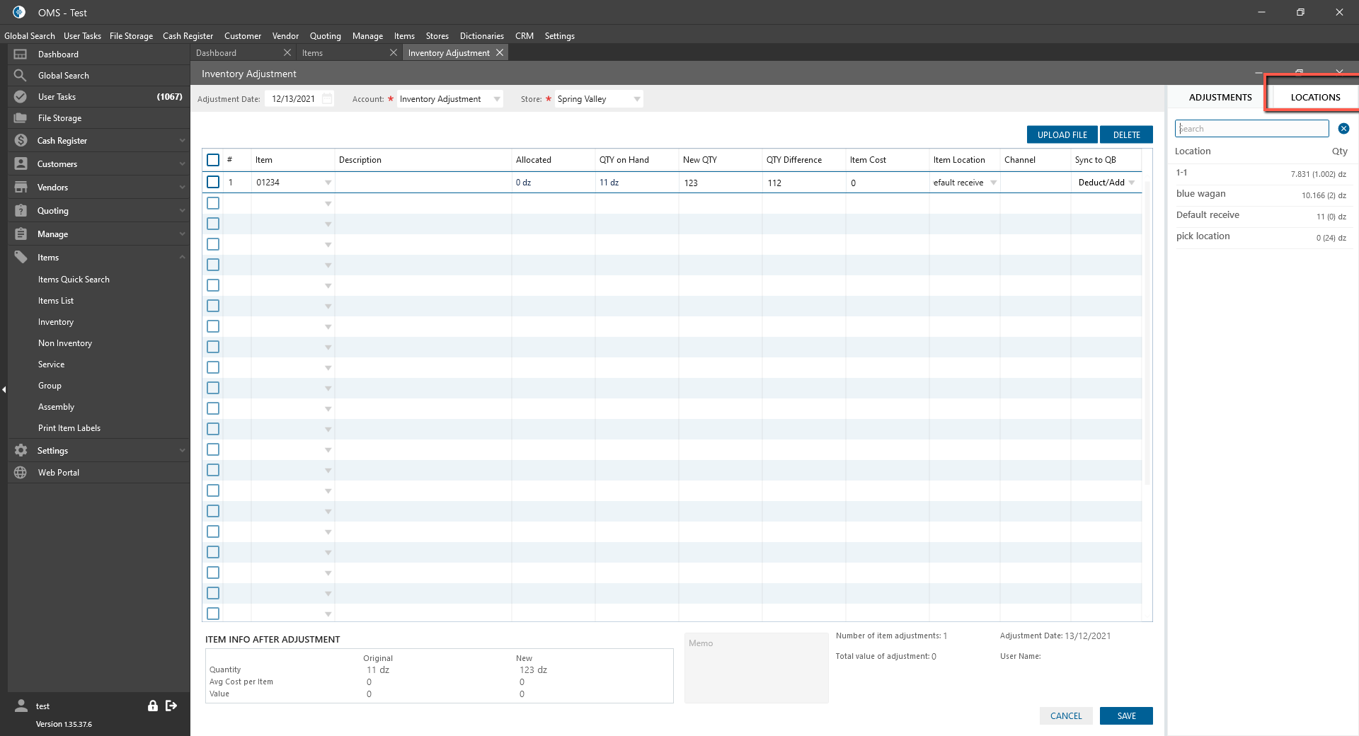 - Item List form -> Item edit form -> Create New PO multi-button -> Inventory Adjustment.