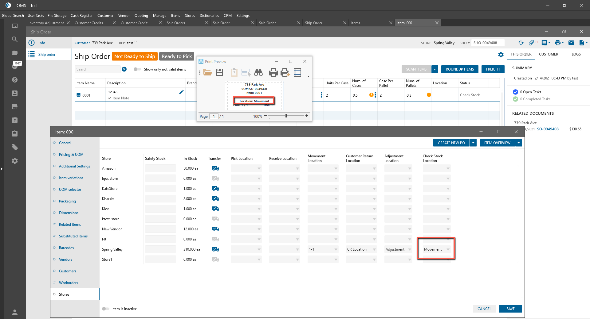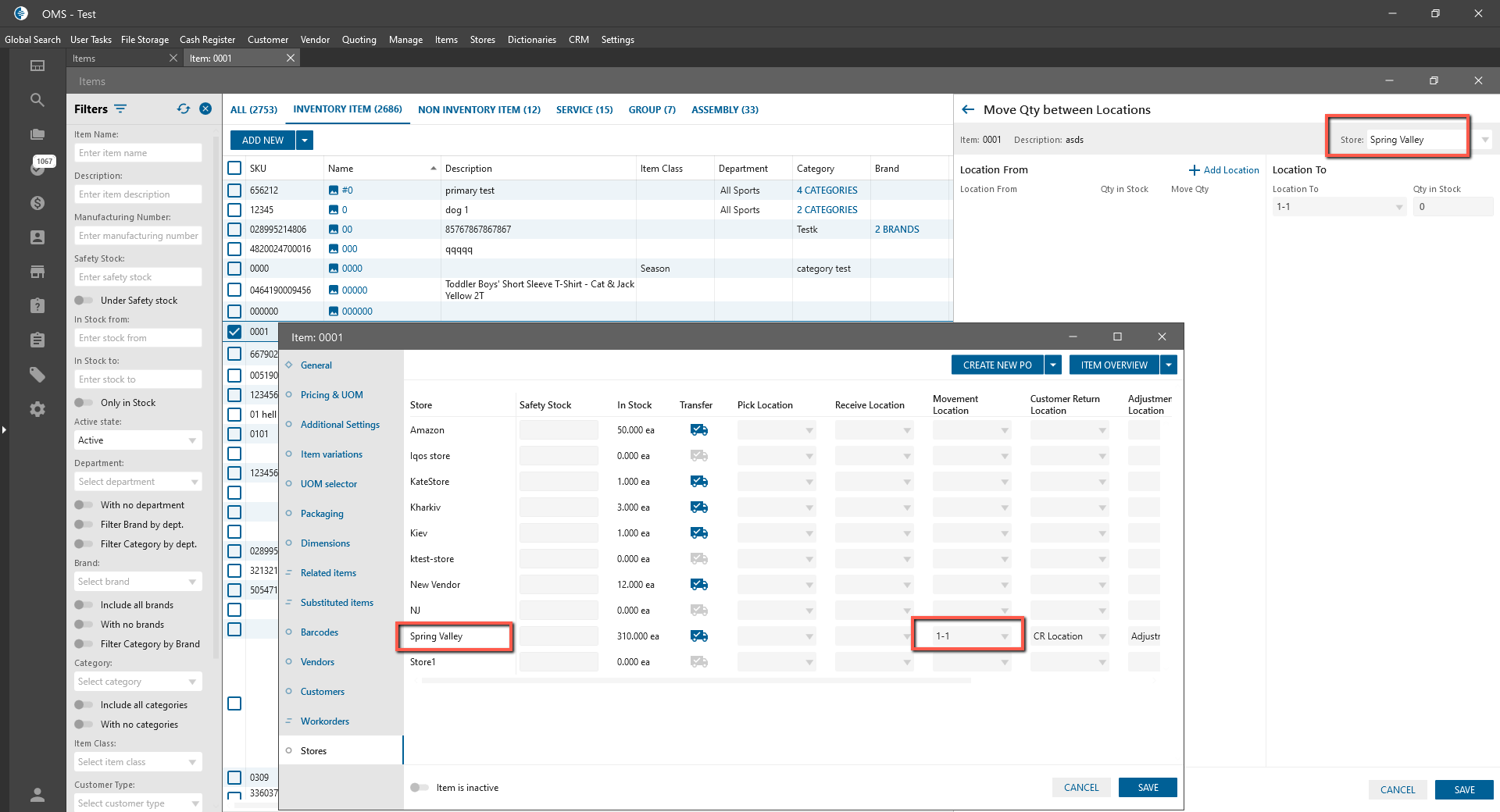 - On the “Move Qty between Location” panel for the corresponding Store is displayed default item movement location;
