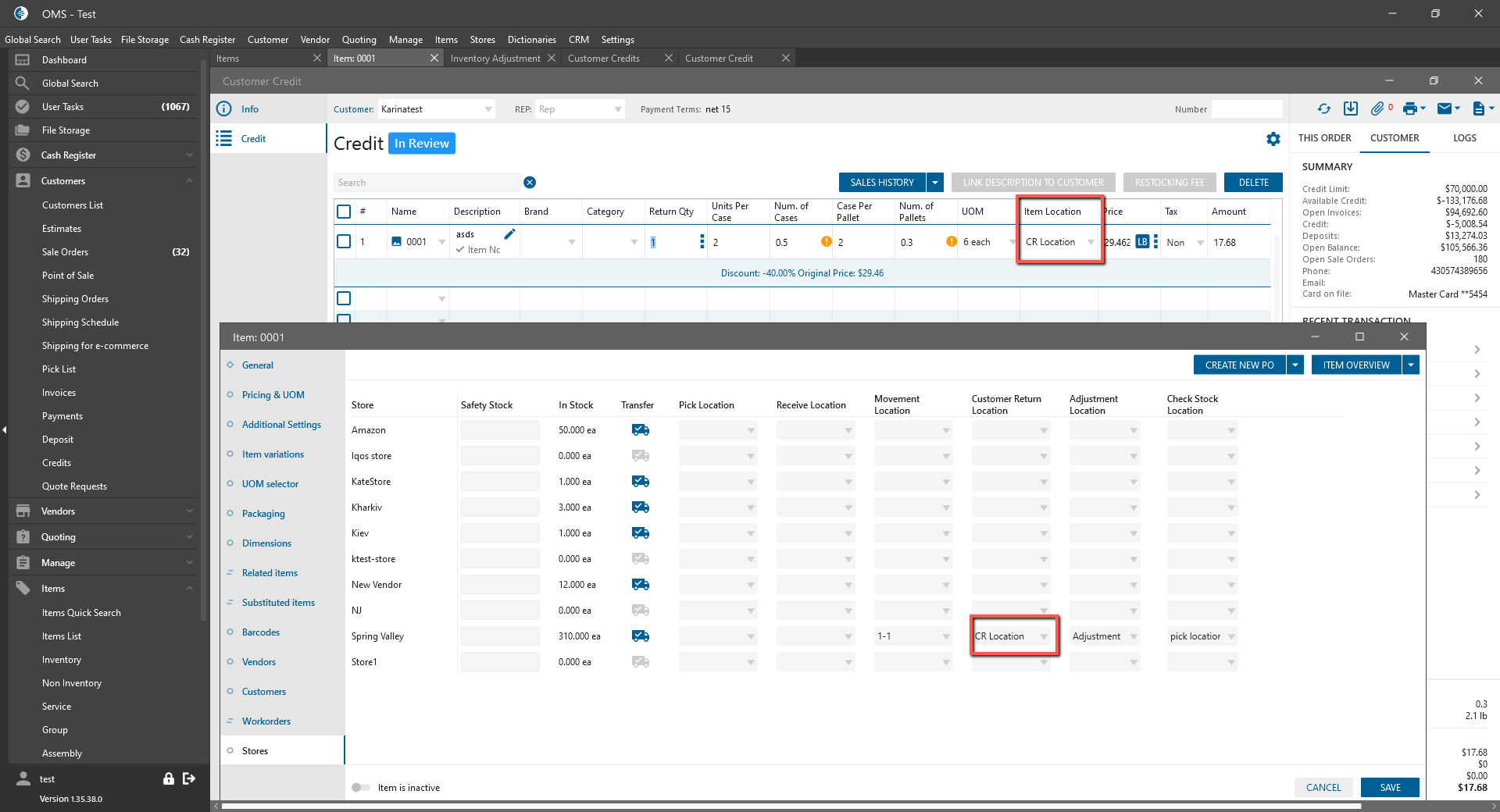 - On the Customer Credit for the corresponding Store is displayed default item return location;